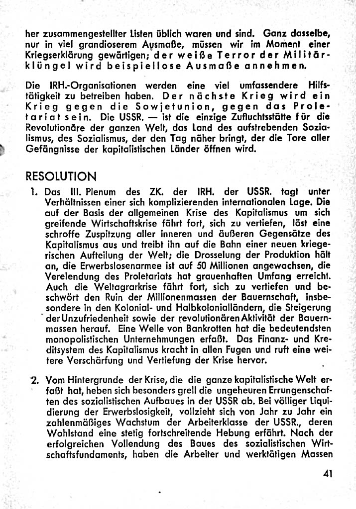 Der Text analysiert die wirtschaftliche und soziale Krise des Kapitalismus in den 1930er Jahren. Er beschreibt die Krise als außergewöhnlich tief und langwierig, geprägt von Überproduktion, Arbeitslosigkeit und Währungskrisen, verbunden mit einer Agrarkrise. Zwei mögliche Auswege werden skizziert: