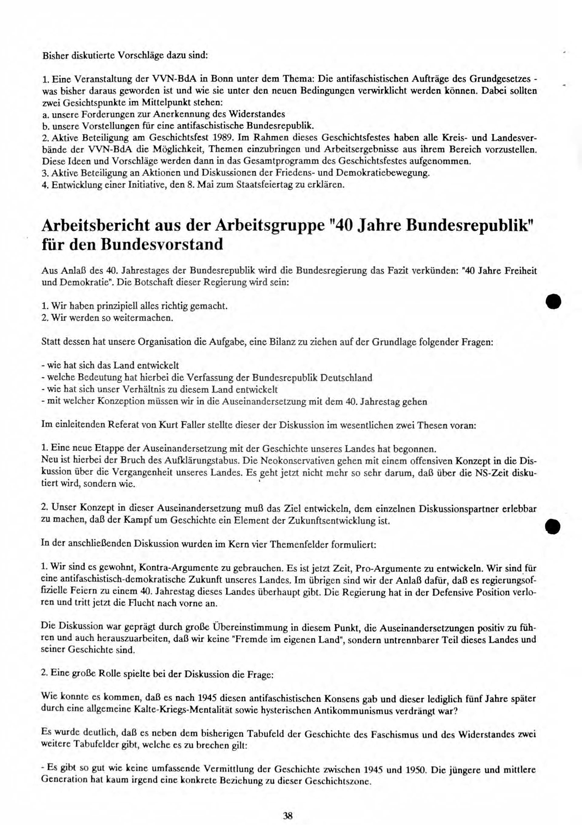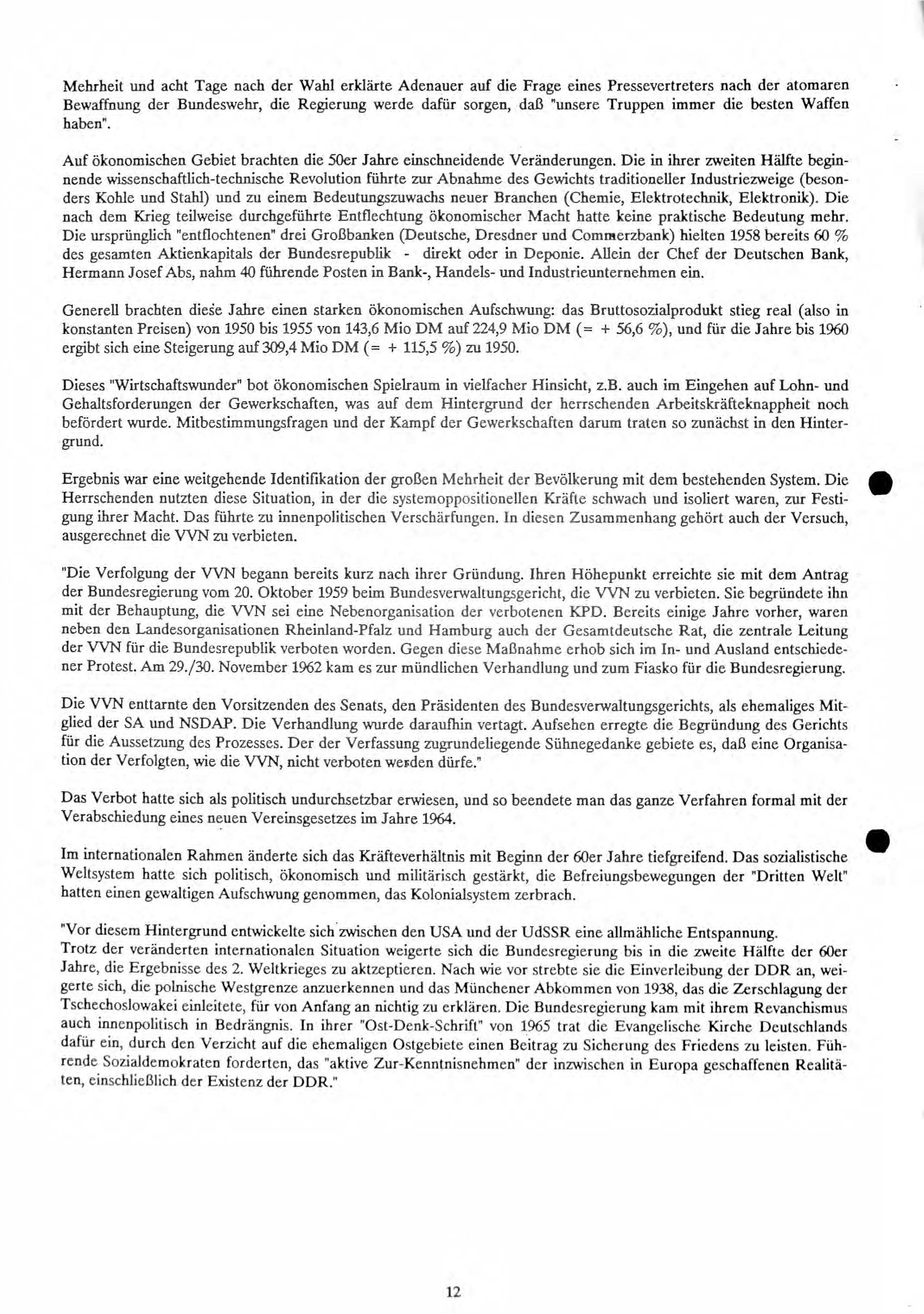Das Dokument beleuchtet die Geschichte der Bundesrepublik Deutschland seit ihrer Gründung im Jahr 1949 bis in die späten 1980er Jahre aus einer antifaschistischen Perspektive. Es beginnt mit der Darstellung der Nachkriegszeit, in der die antifaschistischen Kräfte versuchten, eine neue Gesellschaftsordnung zu etablieren, die sich klar vom nationalsozialistischen Erbe abgrenzen sollte. Diese Bemühungen standen im Spannungsfeld zwischen den alliierten Besatzungsmächten und der beginnenden Konfrontation des Kalten Krieges, der Deutschland in Ost und West spaltete. Die frühen Jahre der Bundesrepublik waren geprägt von restaurativen Tendenzen, die sich in der Wiederintegration ehemaliger NS-Funktionäre in zentrale Positionen von Verwaltung, Justiz und Wirtschaft sowie in einer ablehnenden Haltung gegenüber umfassender Aufarbeitung der nationalsozialistischen Vergangenheit zeigten.