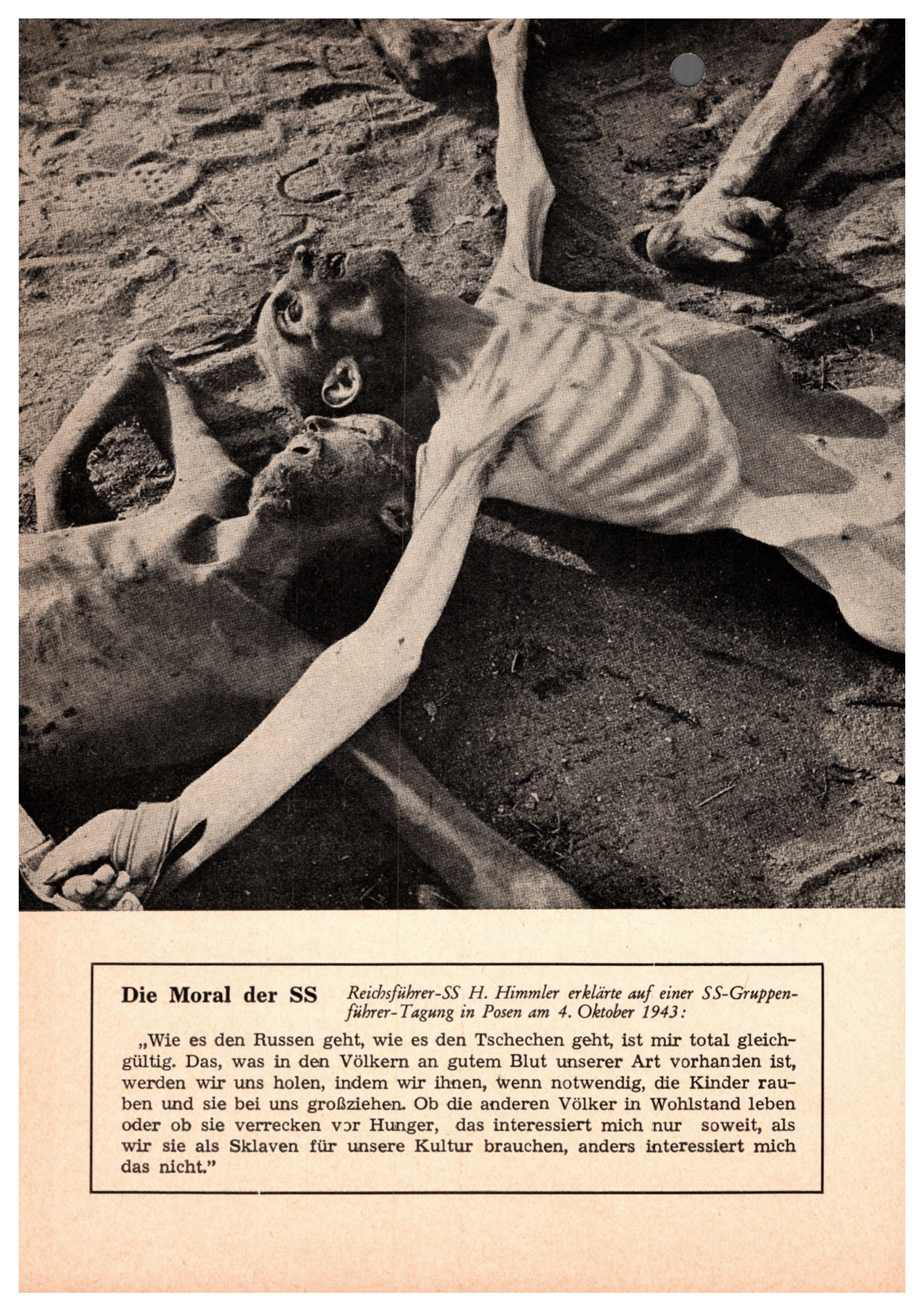 - **Zitate von Heinrich Himmler:** Die menschenverachtende Ideologie der SS wird durch Himmlers Aussagen verdeutlicht, insbesondere seine Gleichgültigkeit gegenüber dem Leid anderer Völker und der Anspruch, deren „gutes Blut“ für die eigene Rasse zu beanspruchen.