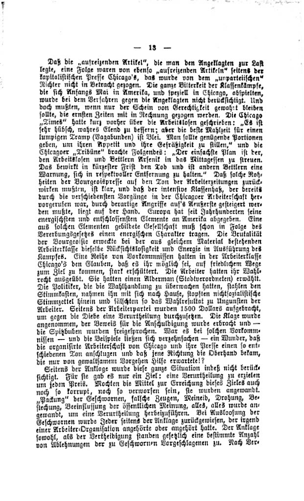 Der Text beschreibt die Ereignisse rund um die Verurteilung und Hinrichtung von Arbeiterführern in Chicago nach den Haymarket-Unruhen von 1886. Im Fokus steht die Ungerechtigkeit der Prozesse, bei denen die Männer weniger wegen konkreter Taten, sondern aufgrund ihrer politischen Überzeugungen verurteilt wurden. Die Hinrichtungen sollten die Arbeiterbewegung und ihre Forderungen, insbesondere nach einem Acht-Stunden-Tag, unterdrücken. Dabei wurde die Bewegung als anarchistisch dargestellt, obwohl es sich um breitere soziale Kämpfe handelte. Der Text kritisiert die Klassenjustiz und sieht in den Urteilen ein Symbol für die Unterdrückung der Arbeiterklasse durch die Obrigkeit, die jede revolutionäre Veränderung zu verhindern sucht.