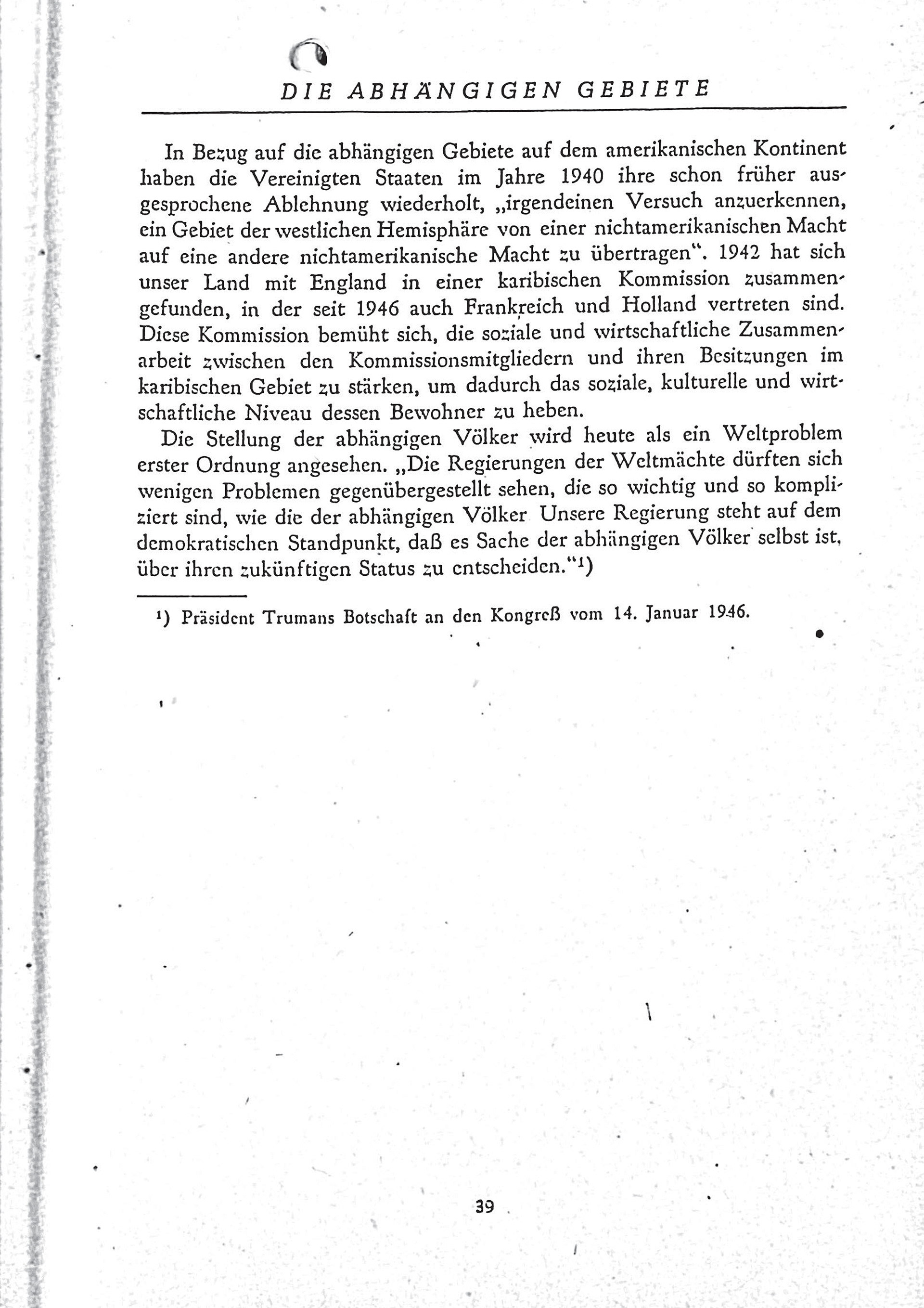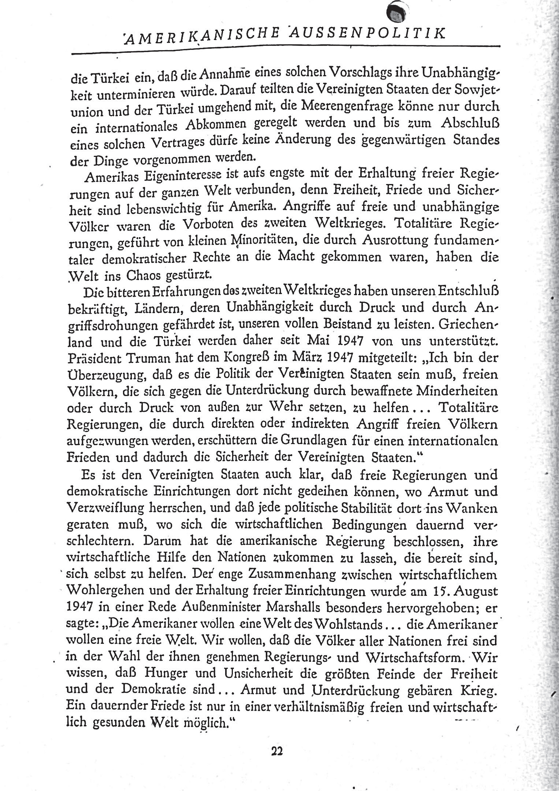 Die langfristigen Ziele der USA in der Nachkriegszeit wurden von Präsident Truman 1945 formuliert. Dazu gehören der Erhalt des Friedens, die wirtschaftliche Erholung der Welt, die Förderung demokratischer Werte und die Schaffung von Institutionen zur Friedenssicherung. Auch wenn die Umsetzung dieser Ziele internationale Zusammenarbeit erfordert und nicht ausschließlich von den USA erreicht werden kann, fühlen sich die USA aufgrund ihrer globalen Verantwortung verpflichtet, in gemeinsamen Anstrengungen Lösungen für die drängenden Probleme der Nachkriegszeit zu suchen.