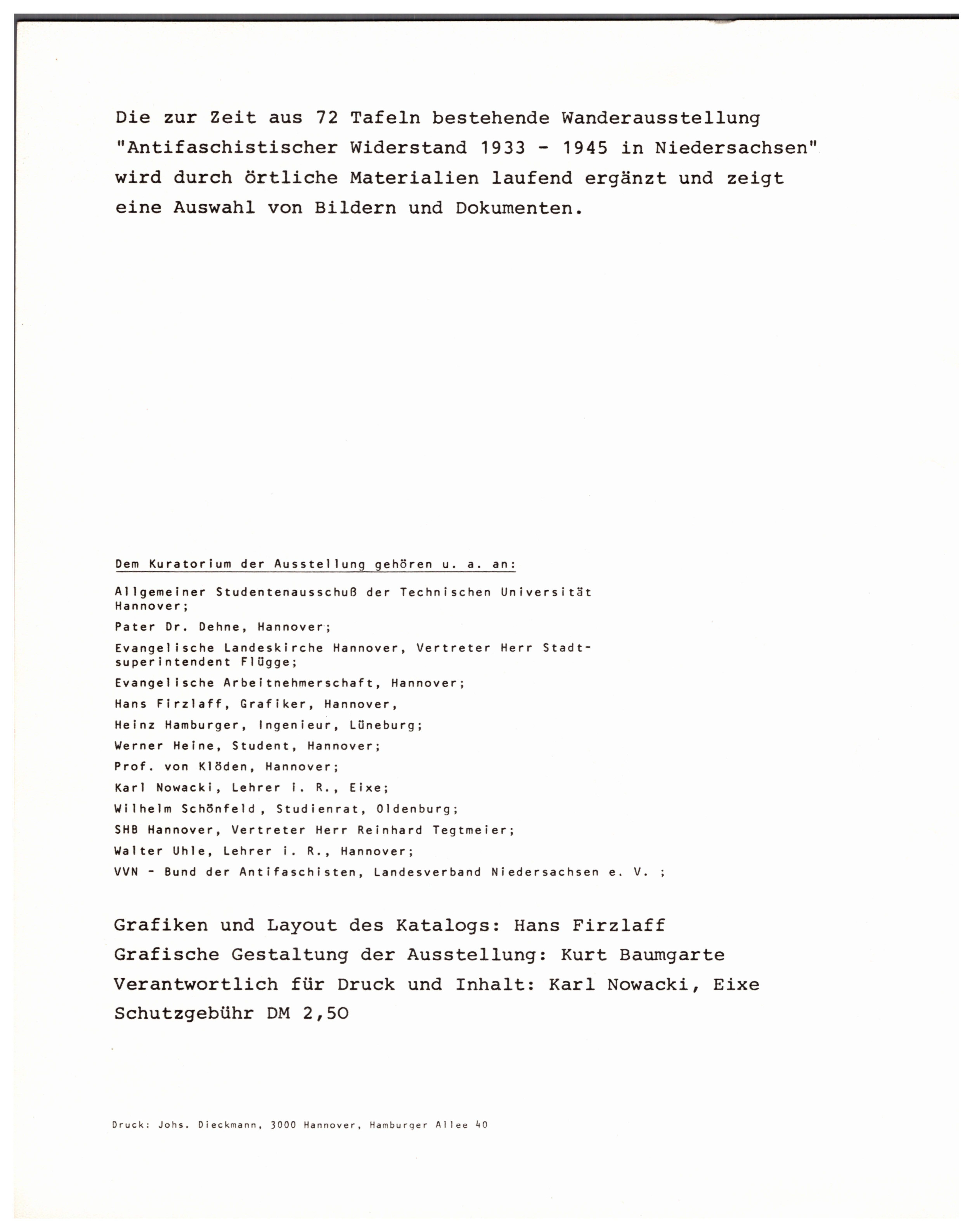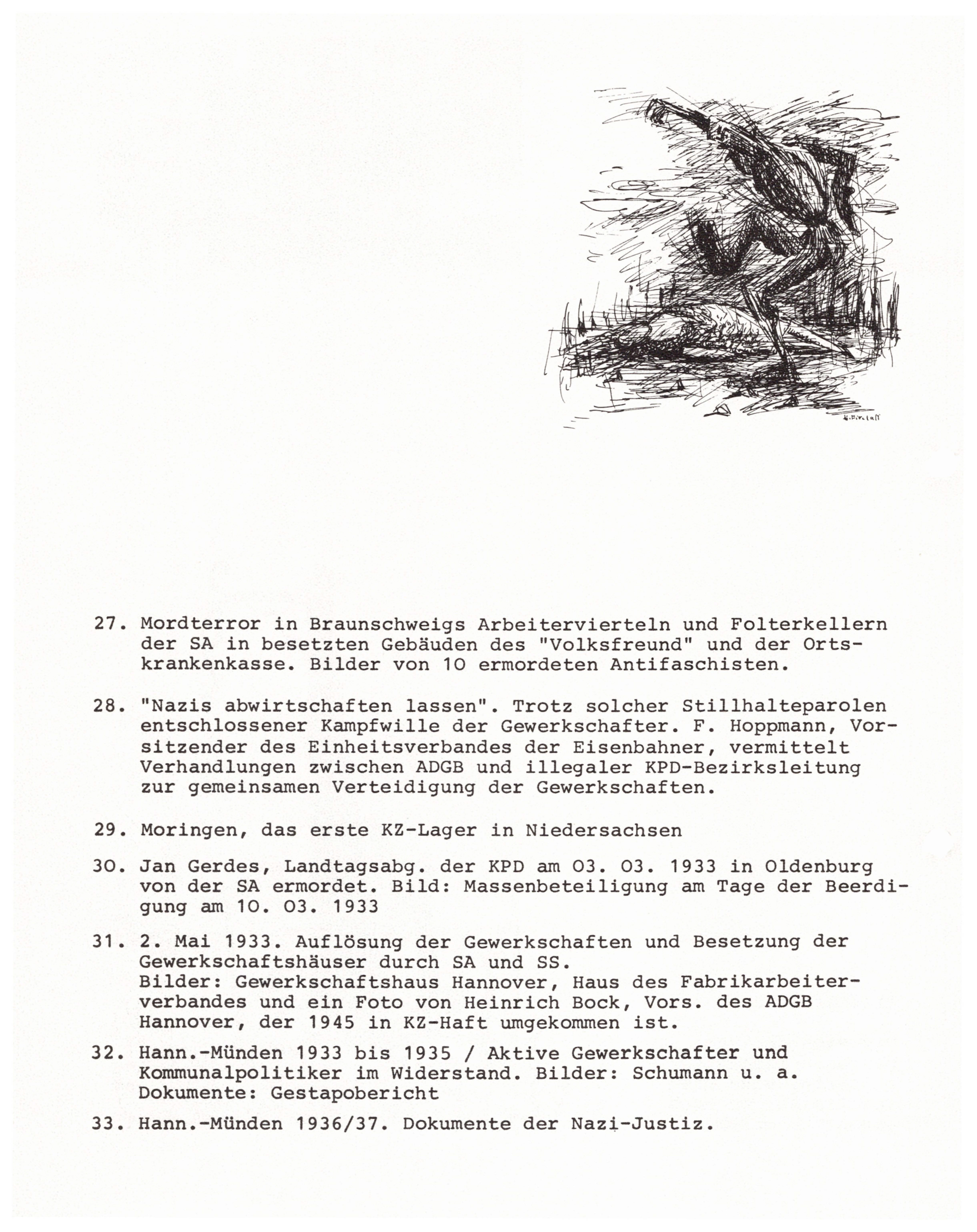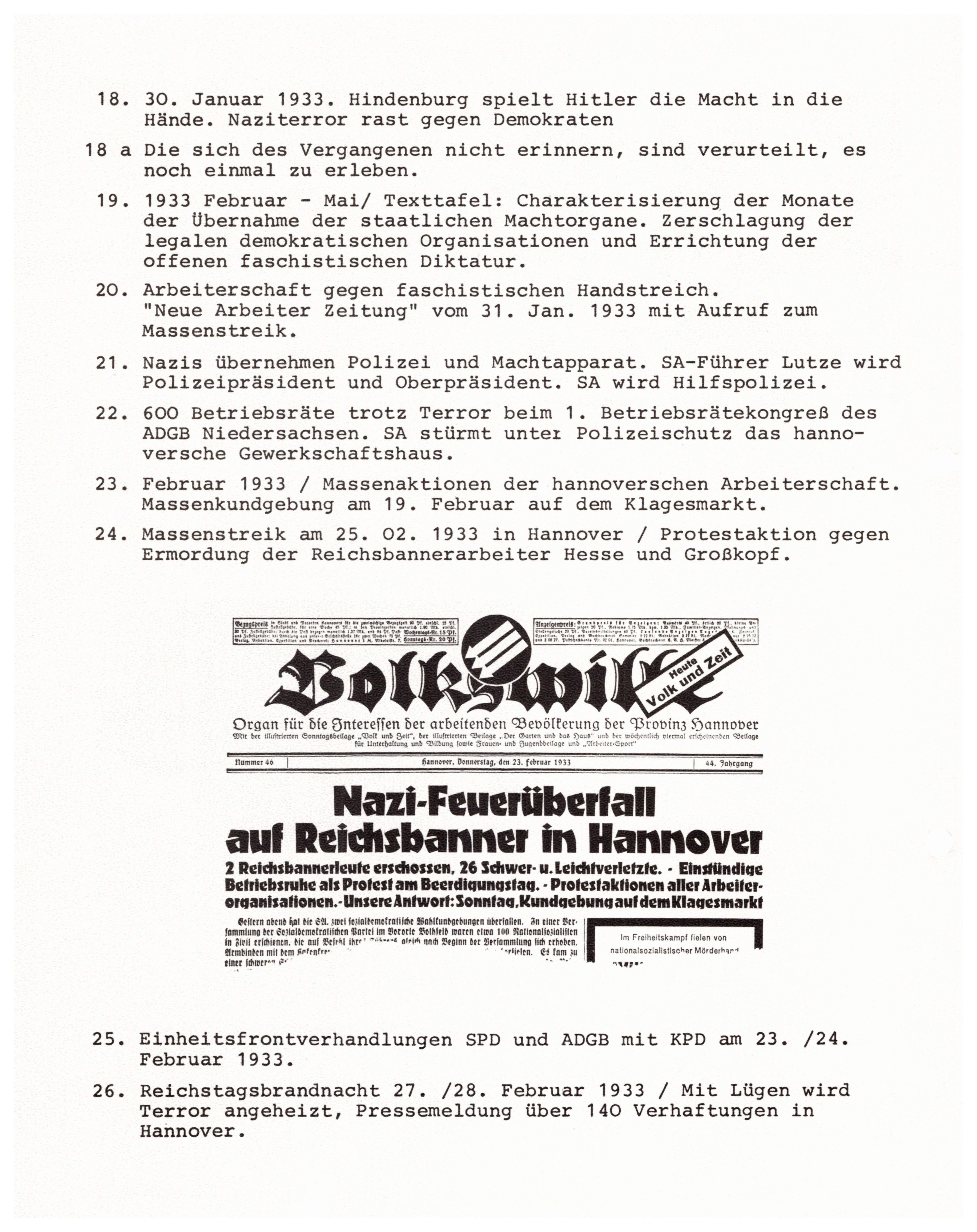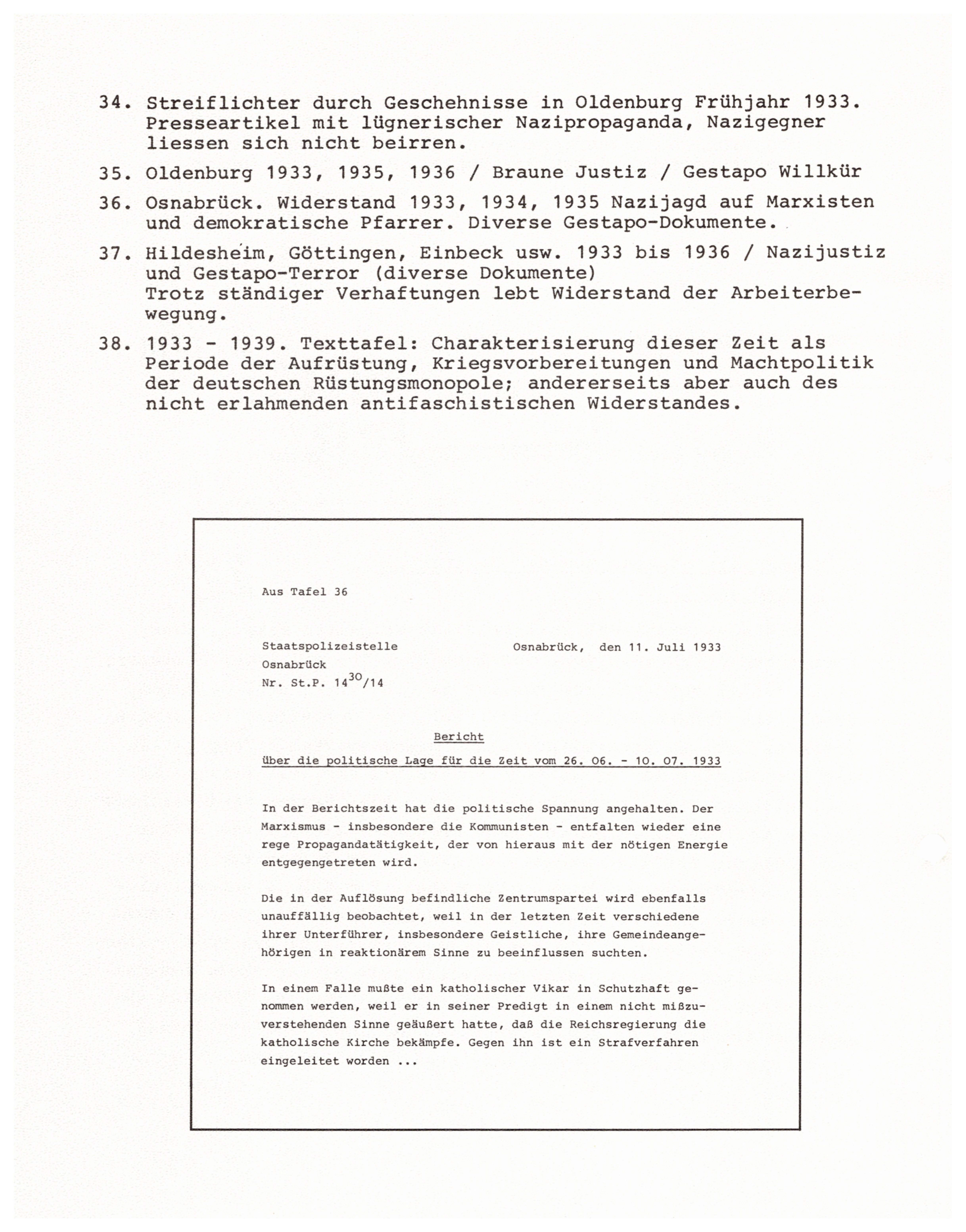 Die Wanderausstellung "Antifaschistischer Widerstand 1933–1945 in Niedersachsen" beleuchtet den Widerstand gegen den Nationalsozialismus in dieser Region und präsentiert auf 72 Tafeln eine Vielzahl von Bildern, Dokumenten und Texten. Sie zeigt die gesellschaftlichen und politischen Kämpfe während der Weimarer Republik, den Aufstieg der NSDAP, die Maßnahmen zur Etablierung der faschistischen Diktatur und die vielfältigen Formen des Widerstands, wie Arbeiterproteste, kirchliche Opposition, Jugendaktionen und individuelle Akte des Ungehorsams. Die Ausstellung würdigt die Opfer des Terrors und betont die Bedeutung von Mut, Solidarität und Engagement gegen Unrecht, wobei historische Gestapo-Dokumente und Biografien Widerstandskämpfer*innen veranschaulichen. Im Fokus steht die Botschaft, Lehren aus der Geschichte zu ziehen, Demokratie und Frieden zu verteidigen und wachsam gegenüber Faschismus zu bleiben.