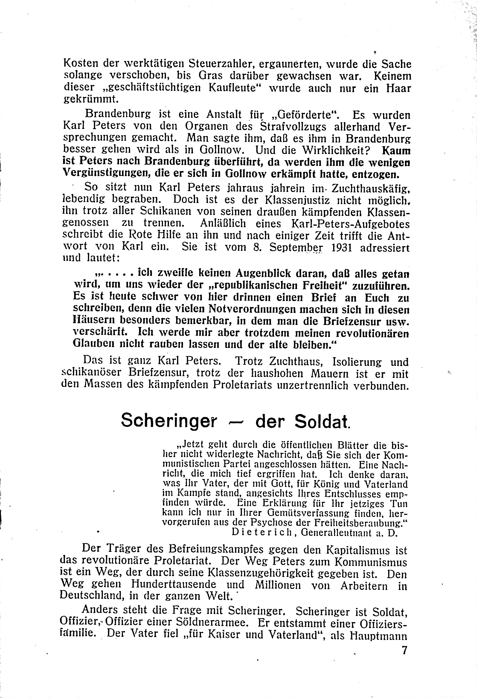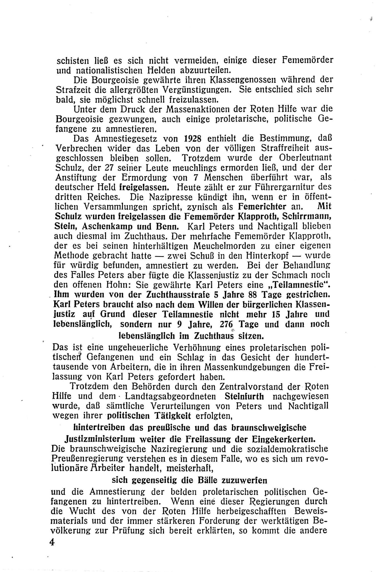 Der Text schildert die Repressionen der Weimarer Republik gegen revolutionäre Arbeiter und die zunehmende Radikalisierung des Klassenkampfes in Deutschland 1932. Im Fokus steht Karl Peters, ein Kommunist aus einfachen Verhältnissen, dessen Leben geprägt ist von Armut, Krieg, politischem Kampf und mehrfacher Flucht. Peters wird zum Anführer der Plättnergruppe, die durch Enteignungen die Revolution vorantreiben will. Nach mehreren Auseinandersetzungen mit der Polizei wird er schwer verwundet, erneut verhaftet und schließlich zu lebenslanger Haft verurteilt. Der Text betont die brutalen Maßnahmen der Bourgeoisie zur Unterdrückung des Proletariats und die Entschlossenheit revolutionärer Kräfte trotz der Gewalt und Verfolgung.