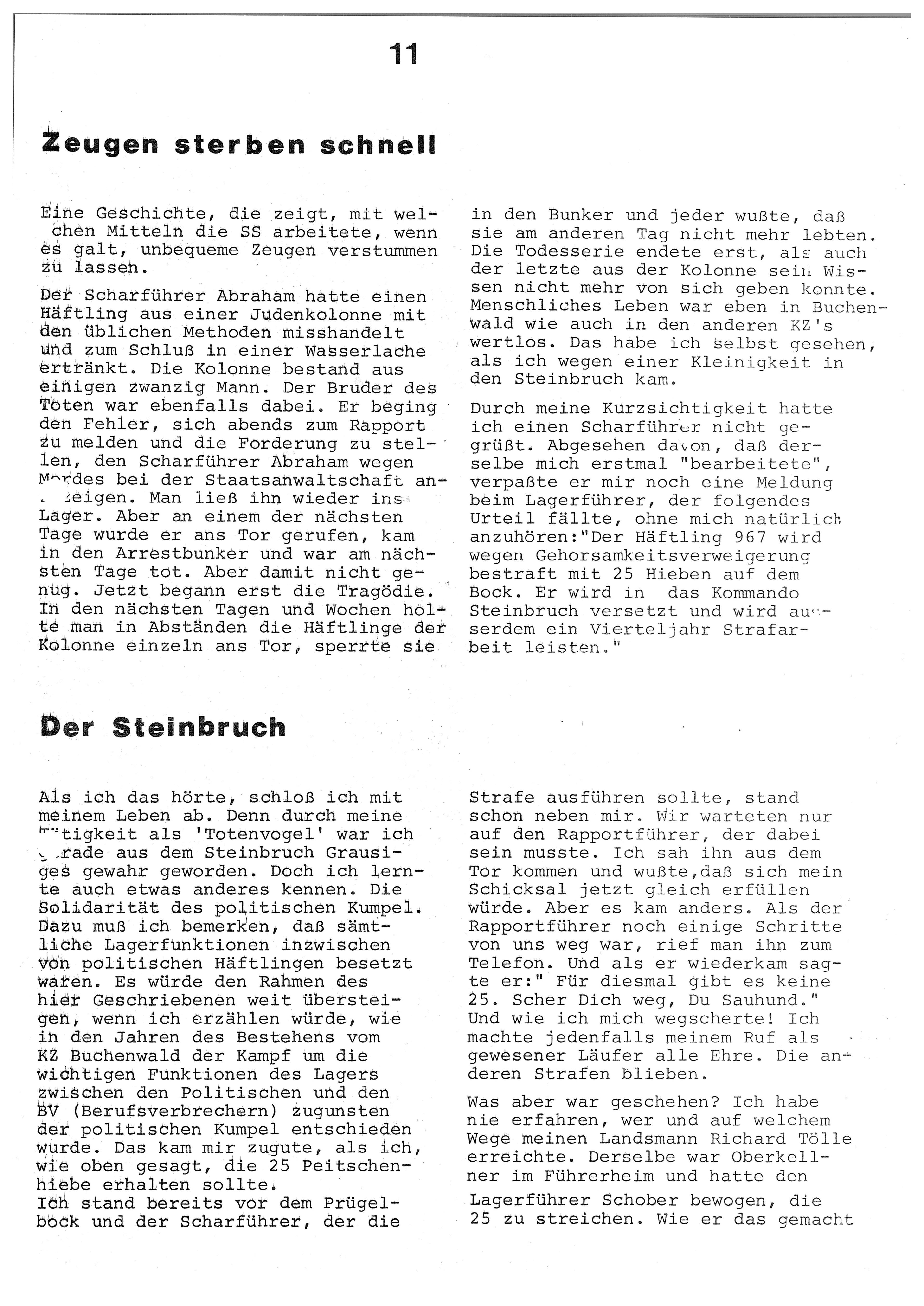 Das Dokument gibt Einblick in die grausamen Bedingungen und unmenschlichen Verbrechen, die während der Zeit des Nationalsozialismus im Konzentrationslager Buchenwald stattfanden. Es schildert systematisch die Methoden der Misshandlung, den Einsatz von Folter, die gezielte Vernichtung von Menschen sowie die unmenschlichen Bedingungen, unter denen die Häftlinge lebten. Besondere Aufmerksamkeit wird der Rolle der SS und ihrer brutalen Praktiken gewidmet, einschließlich der Einführung von Strafen, die bis zum Tode führten. Ebenso zeigt das Dokument, wie Solidarität unter den Häftlingen ein Überleben unter den unmenschlichen Bedingungen erleichtern konnte. Die Berichte sind Zeugnisse der Grausamkeit und dienen als Mahnung, diese Taten niemals zu vergessen.