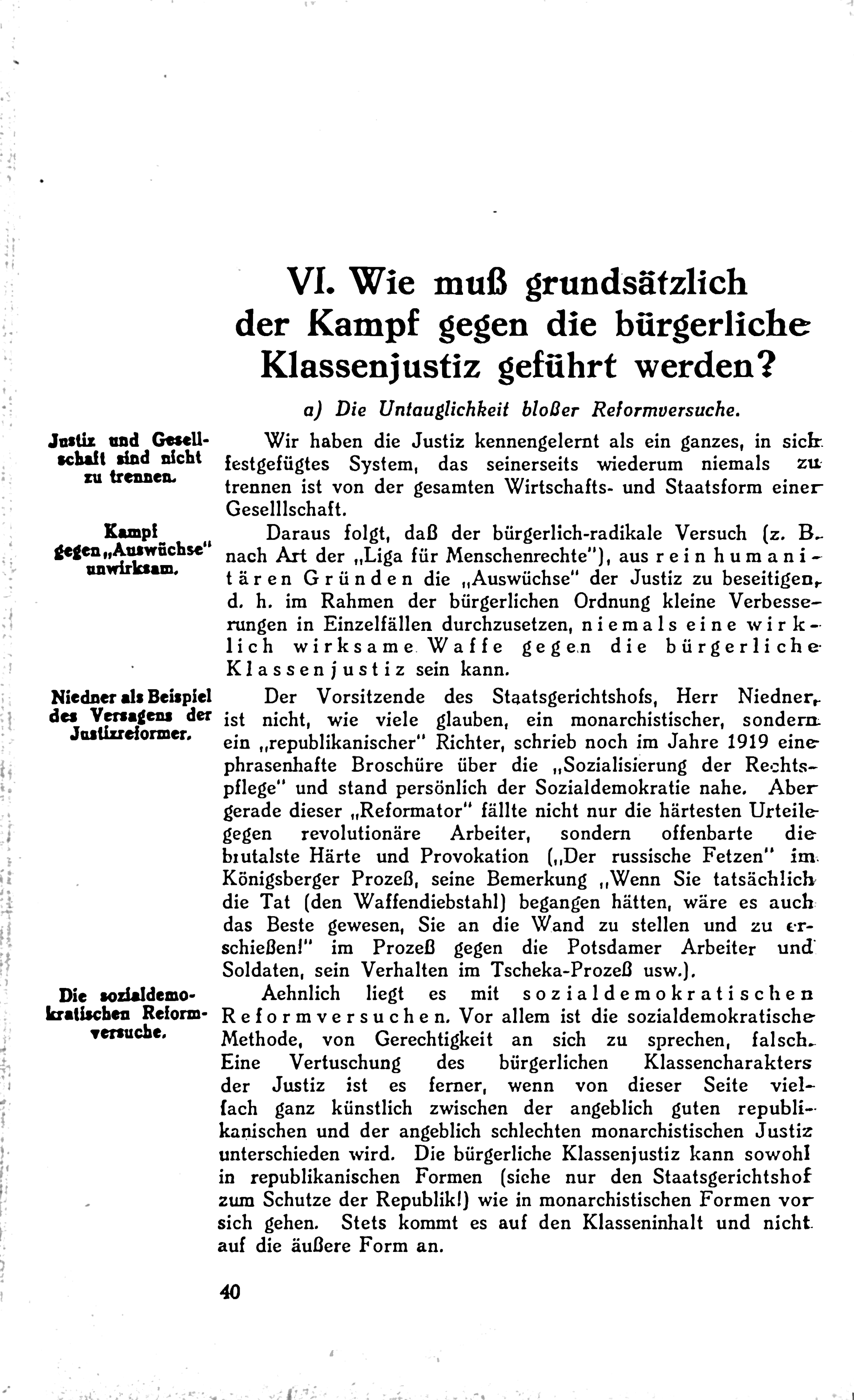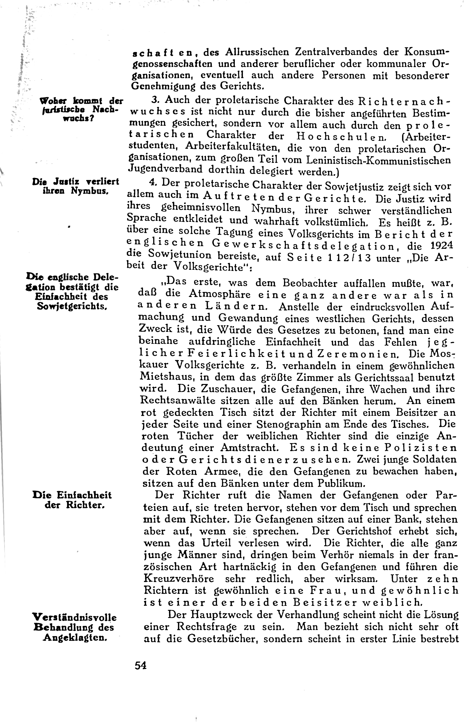 Der Leitfaden fordert einen radikalen Bruch mit der bürgerlichen Justiz zugunsten einer proletarischen Klassenjustiz und beschreibt die Sowjetunion als Modell für eine sozialistische Justizordnung.