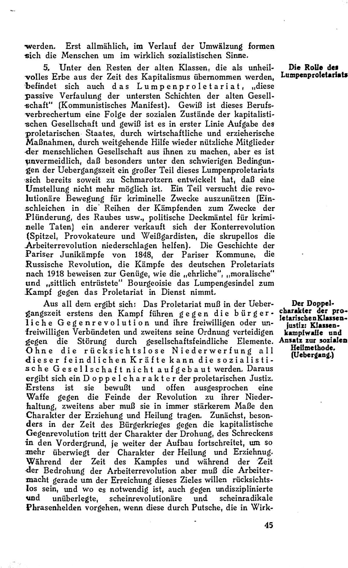 4. **Proletarische Justiz**: Unterschiede zur bürgerlichen Klassenjustiz und ihre Anwendung in der Sowjetunion, einschließlich Strafvollzugsreformen hin zu sozialen Heilmethoden.
