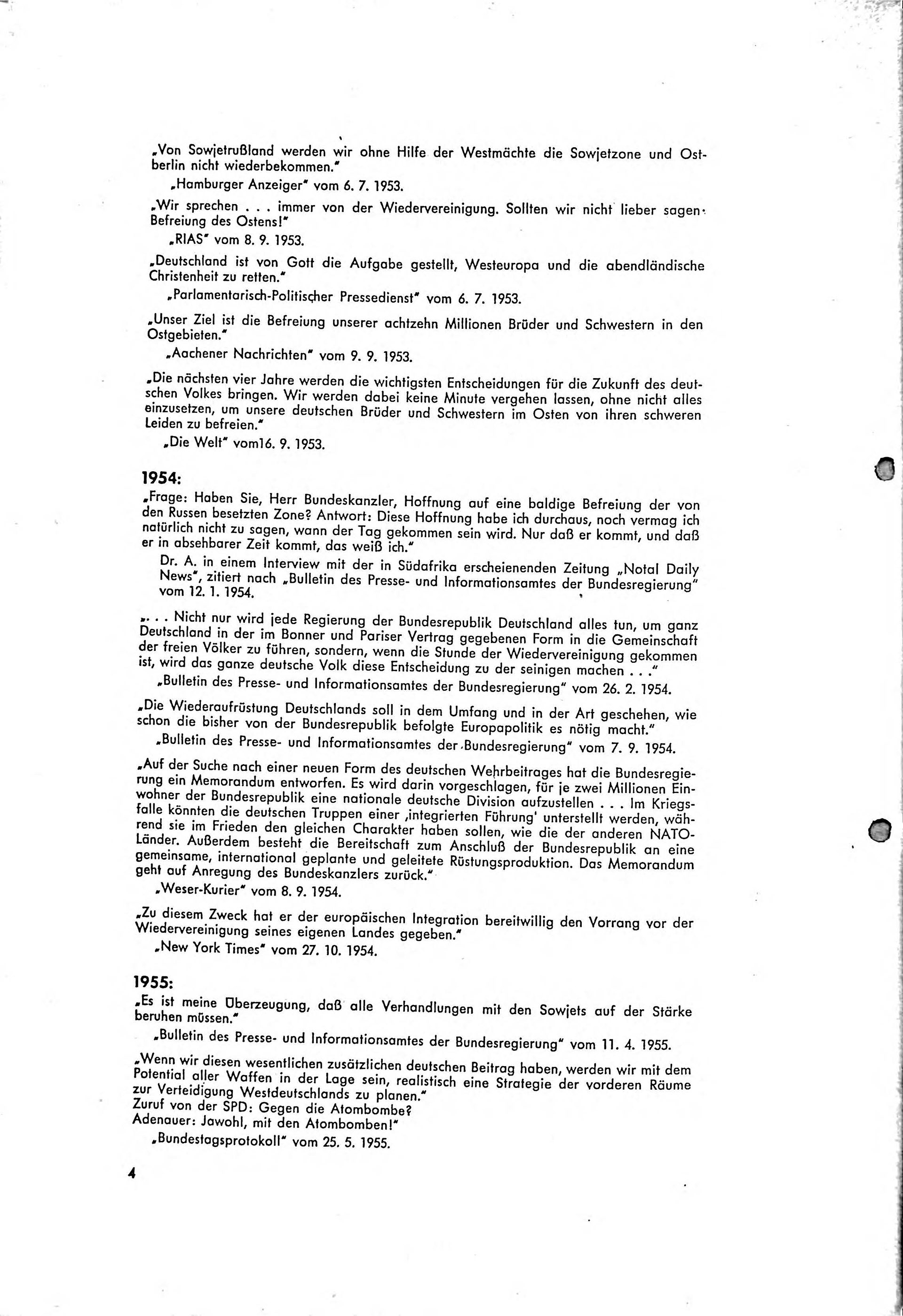 Im Vorwort wird die Absicht erklärt, Fakten statt Polemik zu präsentieren, um die Leser zum Handeln für den Erhalt demokratischer Rechte zu motivieren. Zitate von Politikern wie Bundeskanzler Konrad Adenauer und Außenminister Heinrich von Brentano werden verwendet, um Aussagen über Militarismus und Demokratie zu prüfen. Historische Äußerungen Adenauers aus den Jahren 1946-1952 werden angeführt, um auf Widersprüche und mögliche Tendenzen hinzuweisen. Dabei wird der politische Umgang mit der Vergangenheit sowie die Frage einer Wiederbewaffnung und außenpolitischen Strategien kritisch beleuchtet.