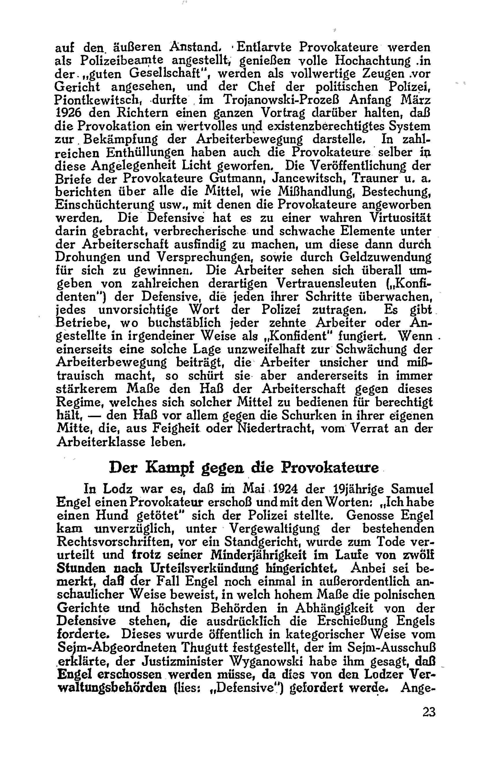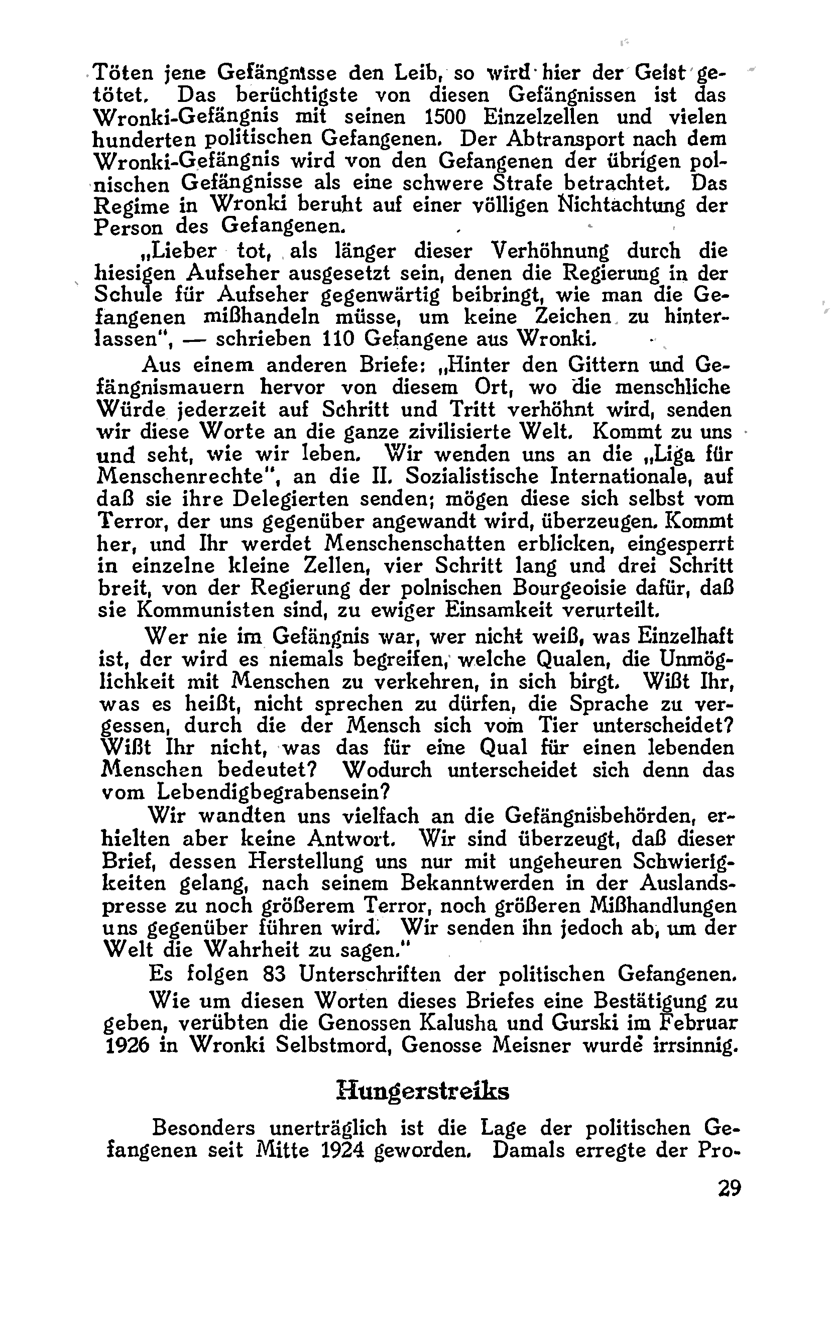Der Text beleuchtet die Zustände in Polen nach dem Staatsstreich von Pilsudski 1926 und thematisiert den "weißen Terror". Trotz internationaler Proteste und Untersuchungen bleibt die Lage in den Gefängnissen katastrophal. Ein Bericht von 1926 bestätigt Folter, Hungerstreiks und brutale Misshandlungen politischer Gefangener. Bescheidene Reformvorschläge, wie die Abschaffung von Folter und die Bestrafung verantwortlicher Beamter, wurden gemacht, hätten jedoch keine grundlegende Verbesserung des repressiven Systems bewirkt. Das polnische Regime wird für systematische Unterdrückung der Arbeiterklasse und Minderheiten sowie für Rechtsverletzungen scharf kritisiert. Der Text fordert dringendes Handeln und Amnestie für politische Gefangene.