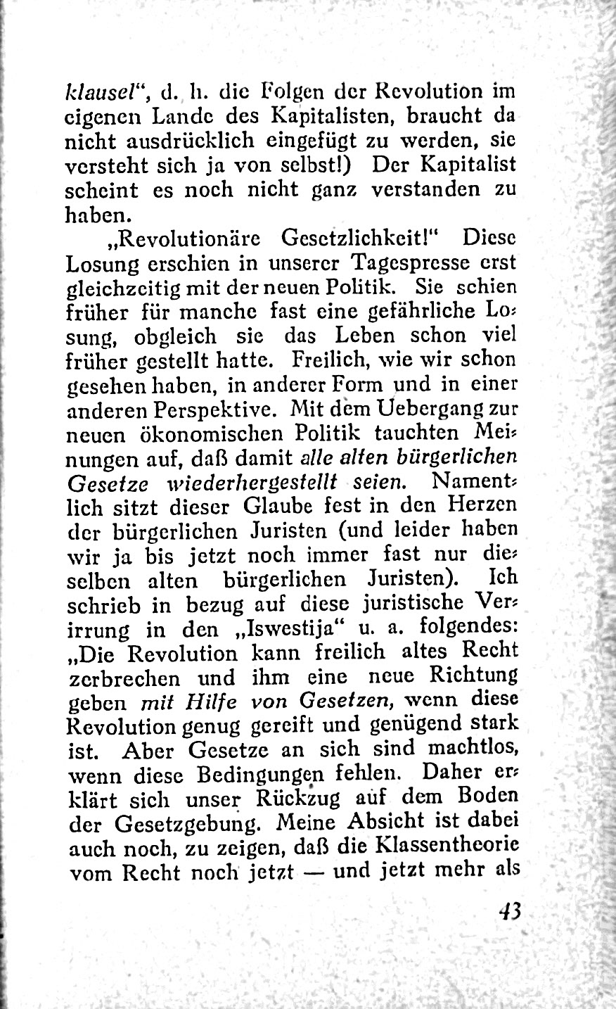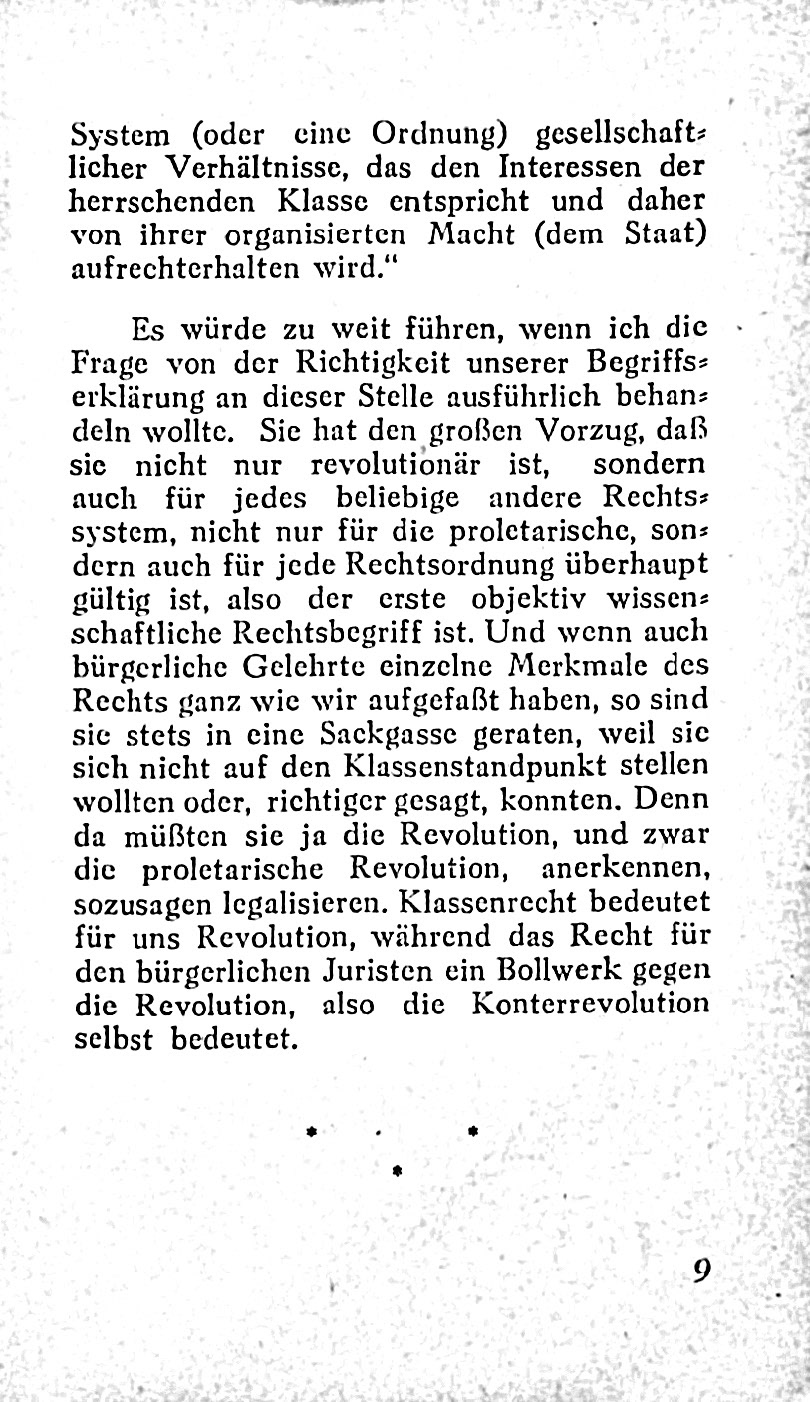 3. **Revolutionäre Perspektive**: Es wird betont, dass jede herrschende Weltanschauung nur durch eine neue verdrängt werden kann. Daher müsse ein proletarisches Rechtsverständnis entwickelt werden, das die grundlegenden gesellschaftlichen Widersprüche offenlegt.