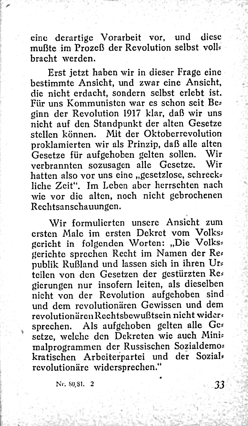 4. **Lehren aus der russischen Revolution**: Die erste proletarische Revolution in Russland wird als Beispiel herangezogen, um die Notwendigkeit eines proletarischen Rechts und einer entsprechenden Justiz zu illustrieren.