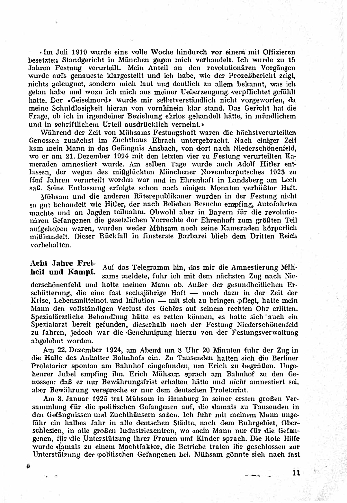 Der Text schildert den Lebens- und Leidensweg des Anarchisten und Antifaschisten Erich Mühsam. Er wurde 1878 in Berlin geboren, wuchs in Lübeck auf und zeigte schon früh eine rebellische Haltung, die zu seiner Relegation vom Gymnasium führte. Nach einer kurzen Tätigkeit als Apotheker widmete er sich seinem künstlerischen und politischen Engagement.