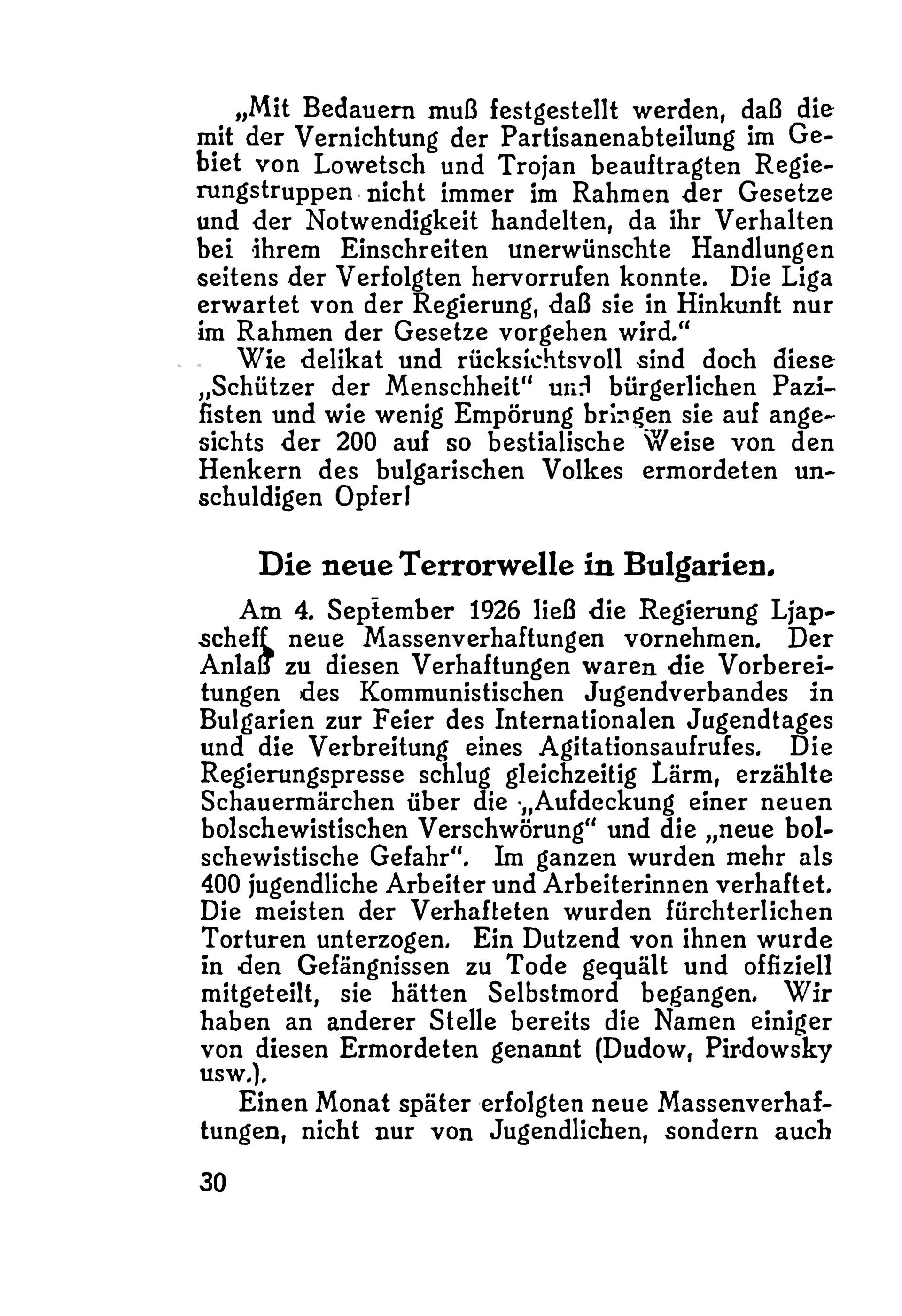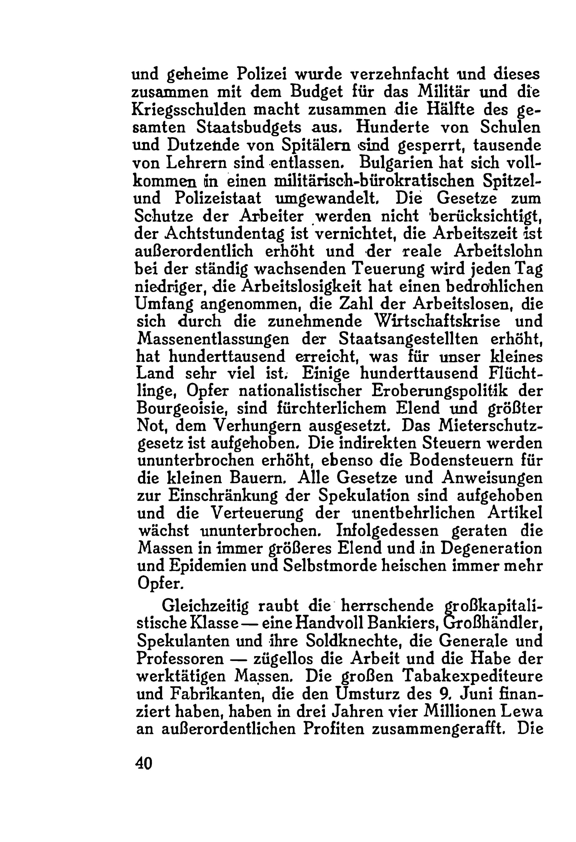 Der Text beschreibt die brutale Unterdrückung und den „weißen Terror“ in Bulgarien während der 1920er-Jahre unter der Herrschaft der Regierung Zankoff, Wolkoff und Ljaptscheff. Er schildert Massenmorde, politische Verfolgungen und systematische Gewalt gegen Arbeiter und Bauern, die sich in einer Atmosphäre von Schrecken und Elend entfalten. Die Broschüre ruft zur internationalen Solidarität auf, um die Gräueltaten zu beenden und die Situation der Arbeiterklasse zu verbessern. Sie stellt detaillierte Beweise für diese Unterdrückung bereit und zielt darauf ab, das Bewusstsein und die Handlungsbereitschaft der internationalen Arbeiterbewegung zu mobilisieren.