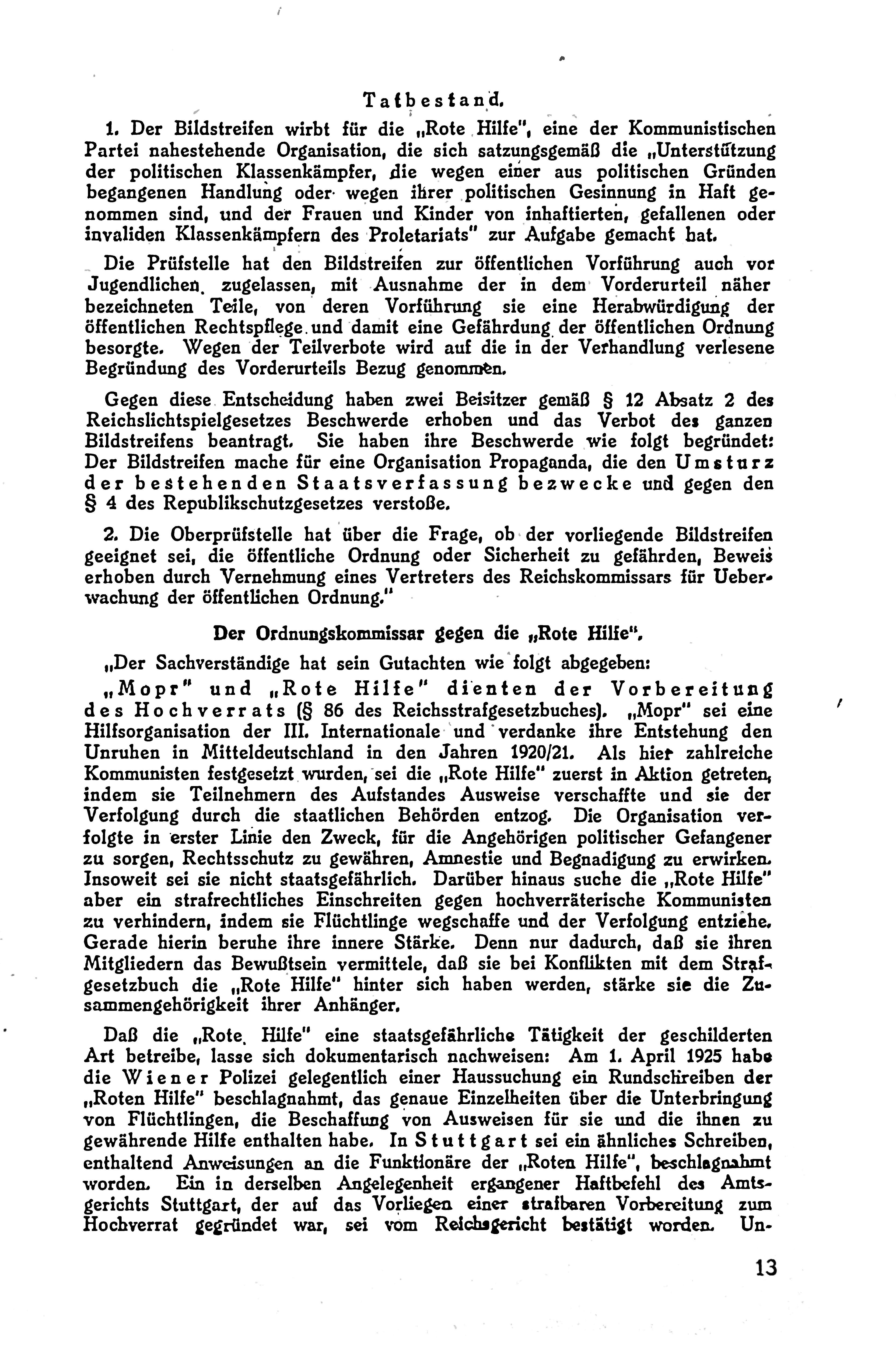 Die „Rote Hilfe“ war eine proletarische Organisation, die politische Gefangene und ihre Familien unterstützte. Sie bot moralische und finanzielle Hilfe, wie Verteidigung, Geldunterstützung, Lebensmittel und Kleidung, um die Folgen der Klassenjustiz zu lindern. Die Organisation unterhielt Kinderheime und organisierte Spenden, größtenteils aus Arbeiterbeiträgen, um Not zu bekämpfen. Zudem prangerte sie Missstände wie willkürliche Verhaftungen und Misshandlungen öffentlich an und kämpfte für die Amnestie politischer Gefangener. Ein Propagandafilm sollte ihre Arbeit zeigen, wurde jedoch als Bedrohung für die staatliche Ordnung angesehen, da er die Brutalität der Klassenjustiz entlarvte. Die „Rote Hilfe“ wurde als Widerstand gegen die Repressionen der herrschenden Klasse verstanden.