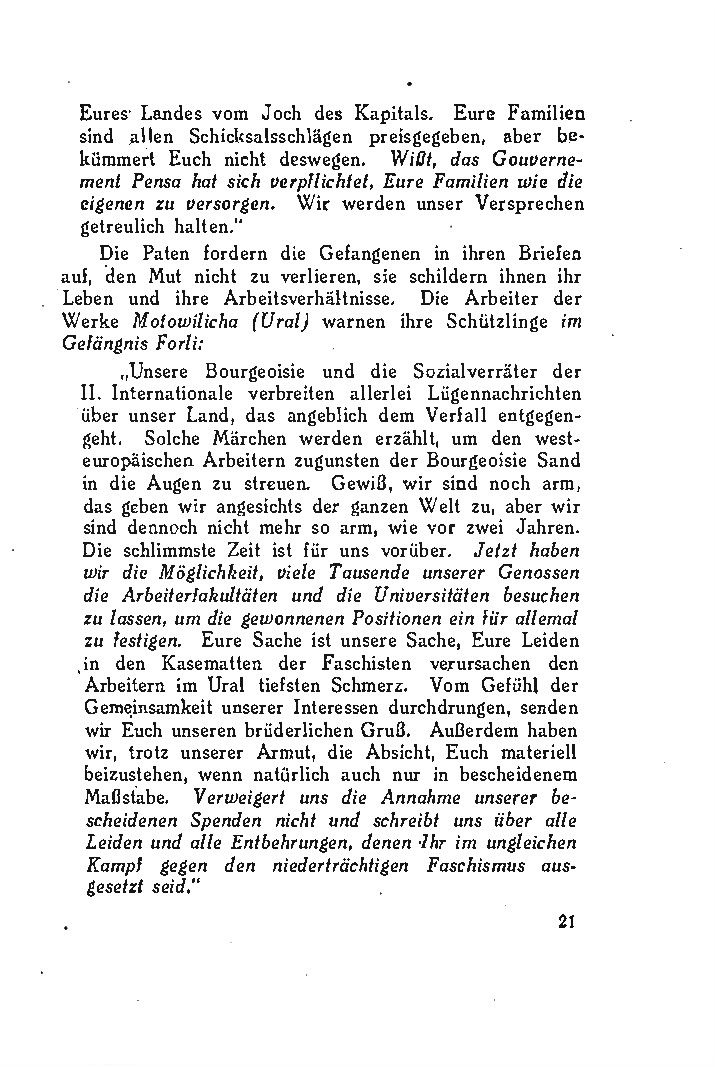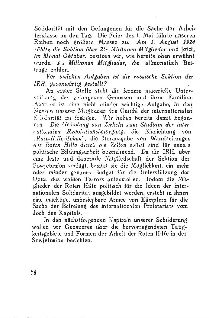 Der Text beleuchtet die Rolle der **Internationalen Roten Hilfe** (IRH), einer Organisation zur Unterstützung politischer Gefangener und ihrer Familien im Kampf gegen die Unterdrückung durch die kapitalistischen Regime und den weißen Terror. Besonders in den kapitalistischen Ländern Europas und den Kolonien wird der Einsatz der IRH als dringend notwendig dargestellt, da dort tausende Arbeiter und Revolutionäre systematisch verfolgt, gefoltert und ermordet werden.