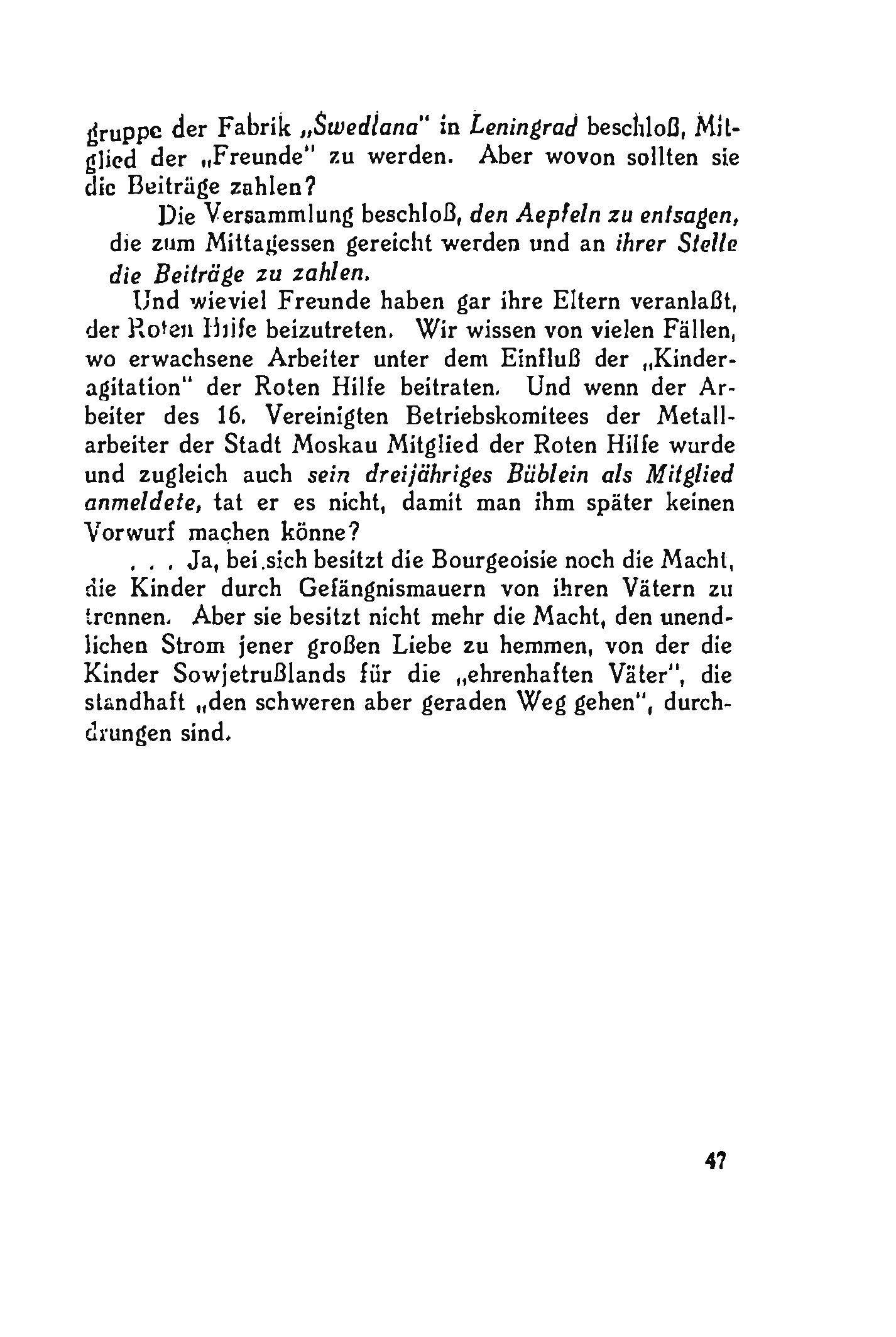 In der Sowjetunion hingegen ist die IRH ein fester Bestandteil des gesellschaftlichen Bewusstseins, und Arbeiter und Bauern leisten trotz eigener Not immense Unterstützung. Diese Solidarität soll als Vorbild für die Arbeiterklasse der kapitalistischen Länder dienen, um die Organisation der IRH voranzutreiben und den Widerstand gegen die repressive Klassenjustiz zu stärken. Ziel ist es, die internationale Arbeiterbewegung durch Solidarität und aktive Hilfe für die Verfolgten zu vereinen und zu stärken.