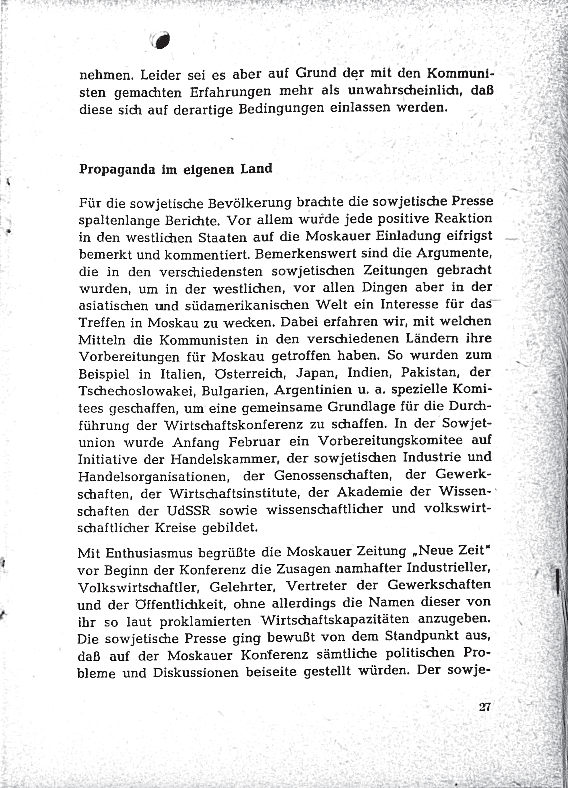 Zusammengefasst lässt sich sagen, dass die Konferenz von den einen als reale Möglichkeit zur wirtschaftlichen Annäherung und Friedensförderung zwischen Ost und West betrachtet wurde, während andere darin eher ein propagandistisches Mittel im Dienst sowjetischer Interessen sahen. Die verschiedenen Reaktionen und Interessen verdeutlichen die Komplexität und die Vielschichtigkeit der internationalen Beziehungen in der frühen Phase des Kalten Krieges, in denen wirtschaftliche Zusammenarbeit als potenzielles Mittel zur Überwindung politischer Differenzen genutzt wurde, jedoch stets unter dem Vorbehalt geopolitischer Vorsicht stand.