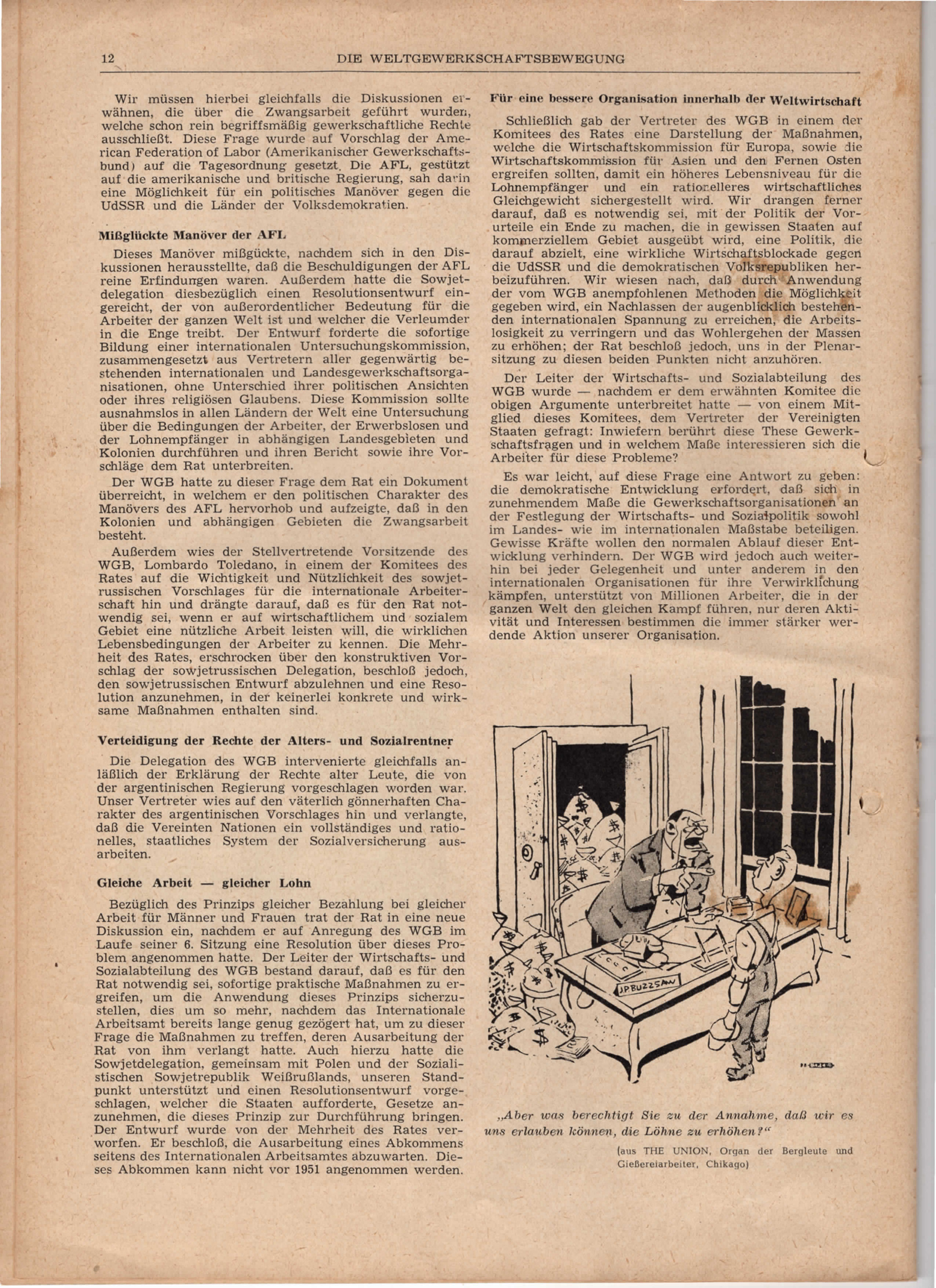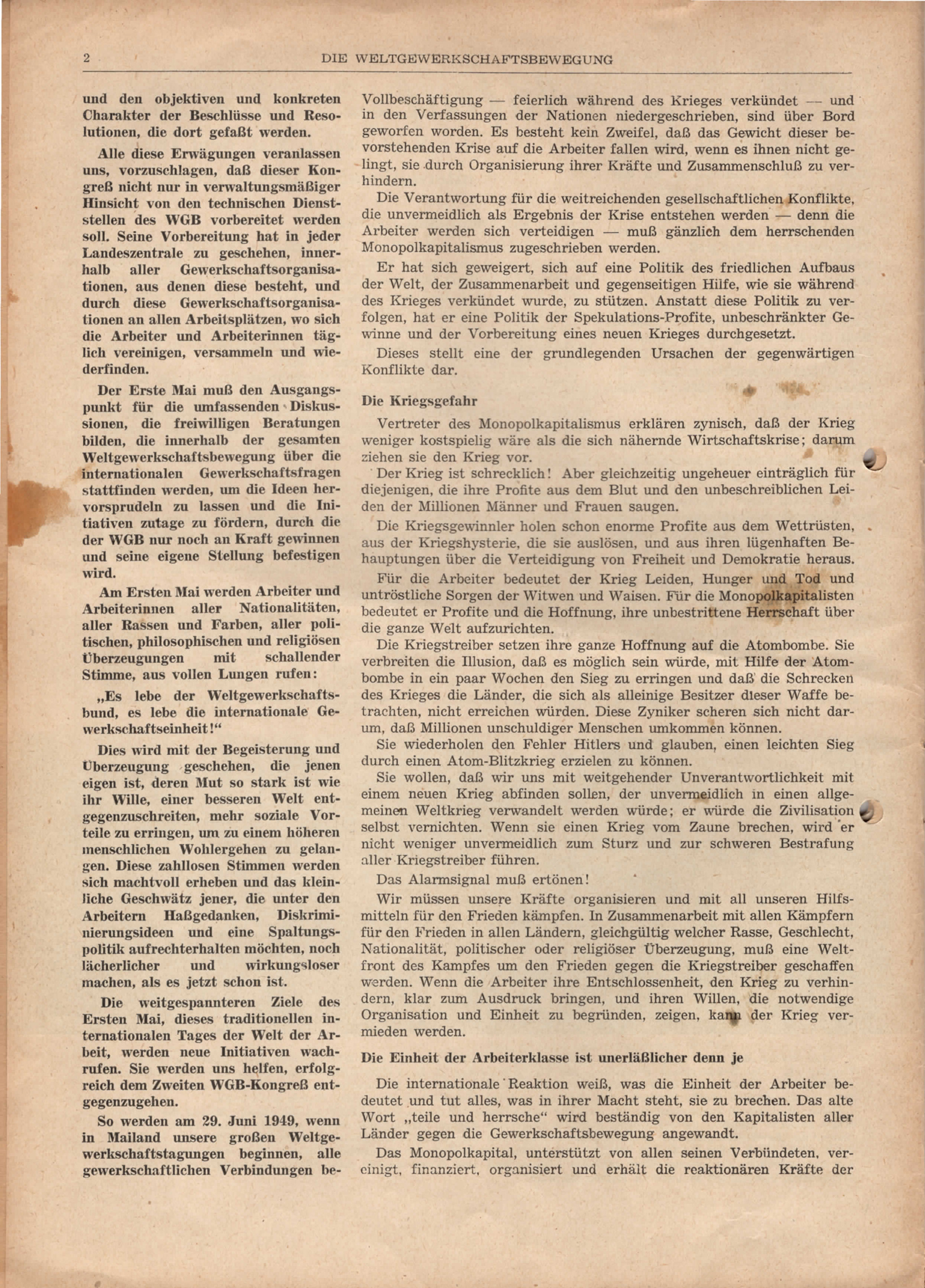 Der Text aus der „Weltgewerkschaftsbewegung“ von Mai 1949 thematisiert die Herausforderungen und Ziele des Weltgewerkschaftsbundes (WGB) in einer Zeit großer sozialer und wirtschaftlicher Spannungen. Der WGB verurteilt Versuche, die Arbeiterbewegung zu spalten, und betont seine Rolle als repräsentative, internationale Stimme der Arbeiter aller Rassen, Nationalitäten und Überzeugungen. Ein zentraler Aspekt ist die Vorbereitung auf den Zweiten Weltgewerkschaftskongress in Mailand Ende Juni 1949, der als bedeutendes Ereignis für die Einheitsbewegung der Arbeiter betrachtet wird. Der Kongress soll nicht nur eine formale Versammlung von Funktionären sein, sondern eine lebendige, repräsentative und wegweisende Plattform, die die drängenden Fragen der Arbeiterbewegung behandelt.