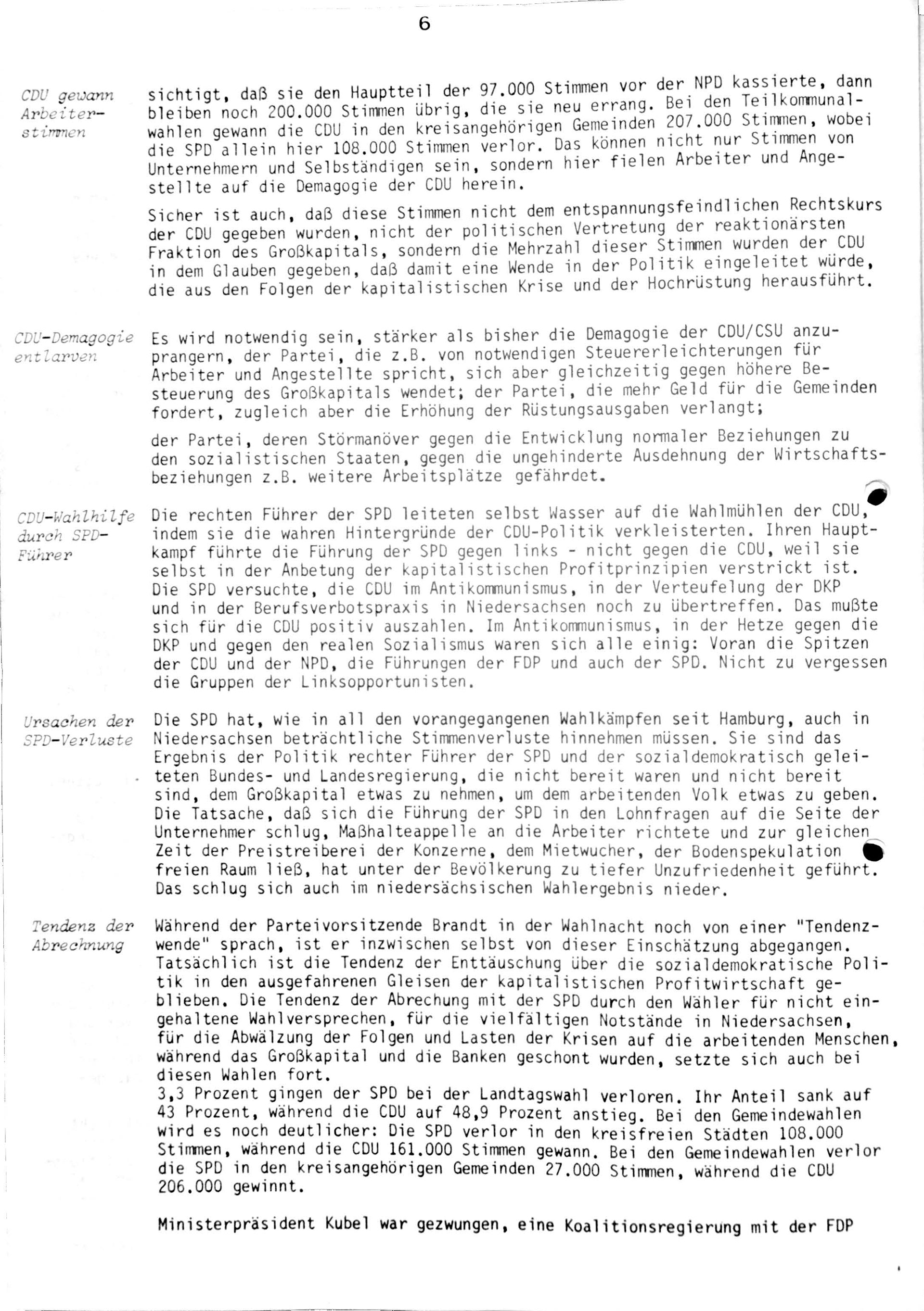 Die vorliegende Pressemitteilung der Deutschen Kommunistischen Partei (DKP) Niedersachsen beleuchtet die Ergebnisse und Erkenntnisse der IV. Bezirksvorstandssitzung vom Juni 1974. Zentrales Thema war die Auswertung des Landtagswahlkampfes, bei dem die DKP trotz einer intensiven Kampagne nicht alle Ziele erreichen konnte, jedoch durch Stimmengewinne und neue Mitglieder gestärkt wurde. Besonders hervorgehoben wurden die gesteigerte Bekanntheit und der erweiterte Einfluss der Partei in bisher wenig erschlossenen Gebieten. Gleichzeitig rief die Partei dazu auf, politische Forderungen wie soziale Sicherung und Arbeitnehmerrechte weiter durch außerparlamentarische Aktionen voranzutreiben. Ein weiterer Schwerpunkt war die Vorbereitung des Pressefestes der „UZ“, mit dem Ziel, die Parteipresse und den Masseneinfluss weiter auszubauen. Abschließend betonte der Bezirksvorstand die Notwendigkeit, die Erfahrungen aus dem Wahlkampf kritisch zu analysieren, die ideologische Arbeit zu verstärken und die sozialpolitischen Vorschläge konsequent in die Praxis umzusetzen.