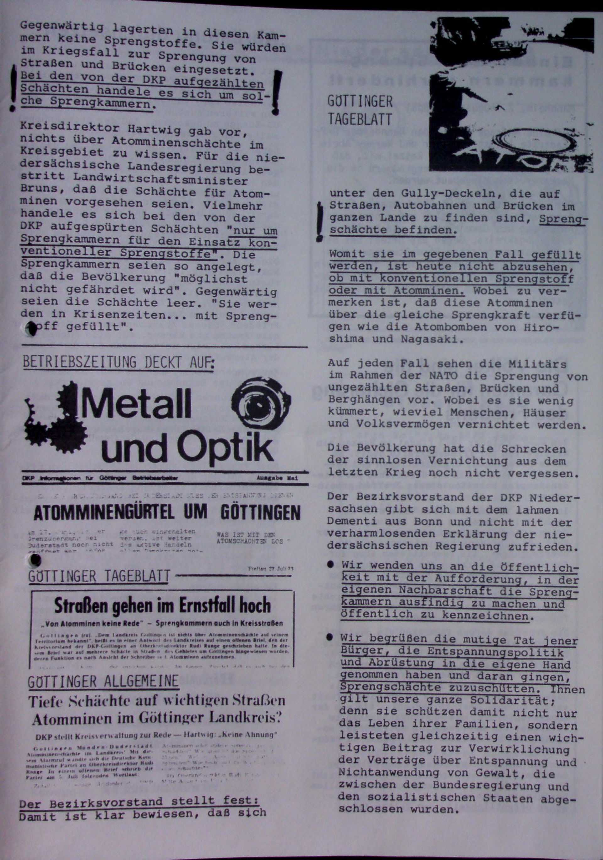 Thema Atomminen: Die DKP Niedersachsen thematisiert Sprengschächte im Landkreis Göttingen, die als potenzielle Standorte für Atomminen oder Sprengstoffe dienen könnten. Die Partei kritisiert diese als Bedrohung für die Bevölkerung und als Widerspruch zur Entspannungspolitik.