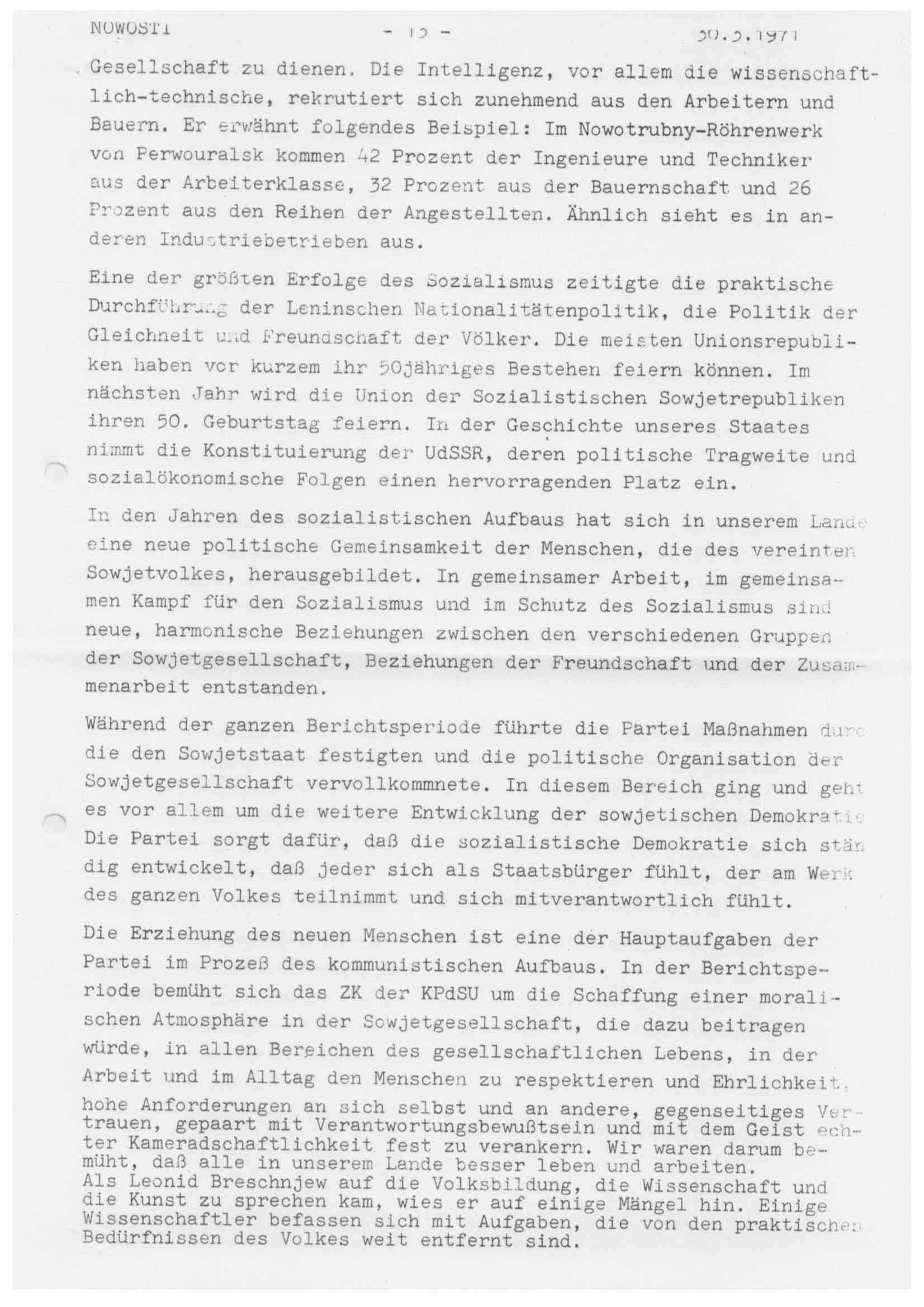 Sozialpolitik: Angestrebt wird eine stärkere Annäherung sozialer Klassen und die Festigung der sowjetischen Gesellschaft durch Förderung von Wissenschaft, Kultur und Bildung. Ziel ist eine weitere Konsolidierung der sozialistischen Demokratie.