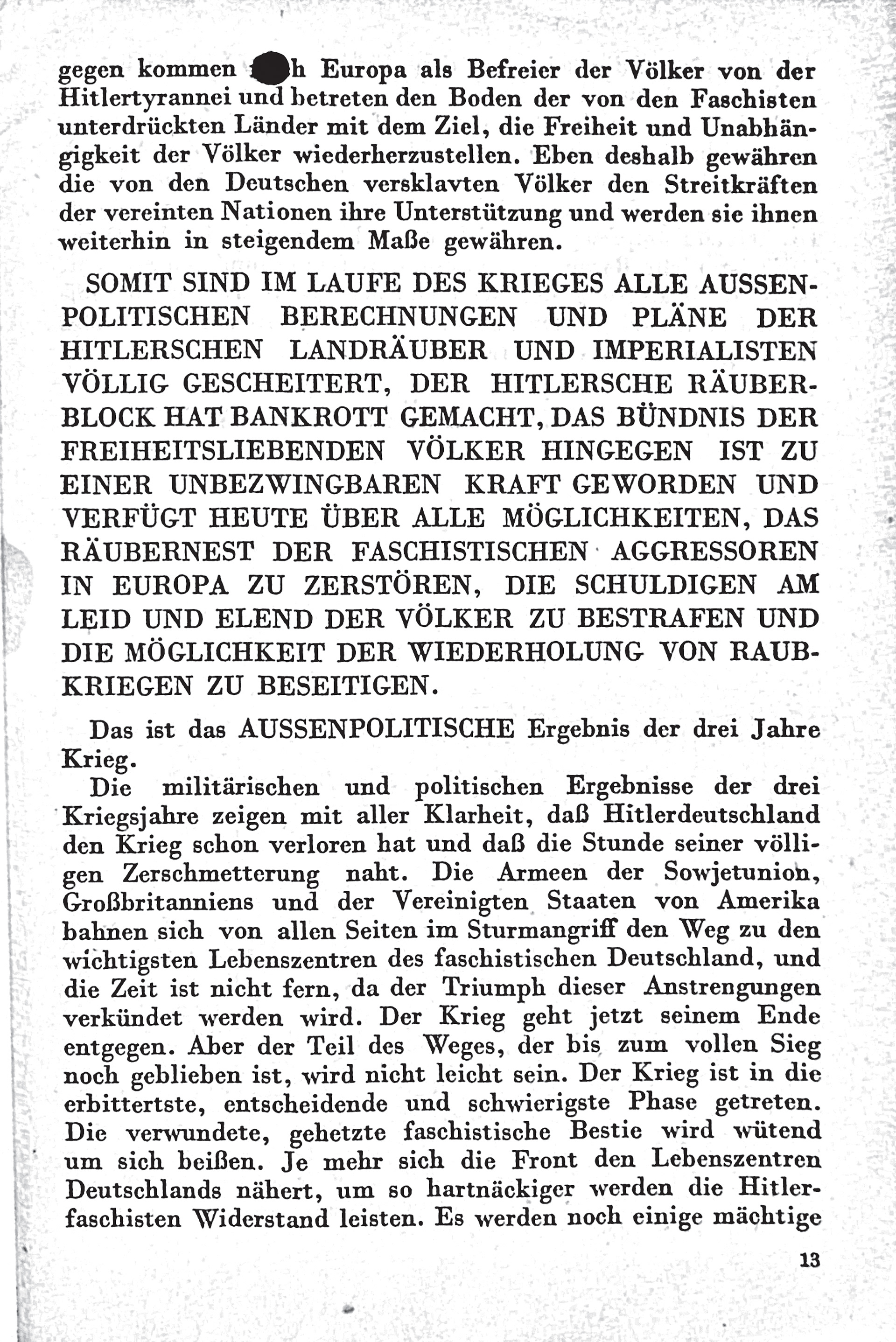 Der Text beschreibt die militärischen und politischen Ergebnisse der ersten drei Jahre des "Vaterländischen Krieges" der Sowjetunion gegen die faschistischen deutschen Truppen während des Zweiten Weltkriegs. Die Sowjetunion wurde am 22. Juni 1941 von Nazi-Deutschland angegriffen, was einen erbitterten Abwehrkampf einleitete, der von der Roten Armee und dem sowjetischen Volk unter hohen Verlusten geführt wurde. Diese Widerstandsleistung wird im Text als heroisch und unerschütterlich dargestellt, wobei der sowjetische Widerstand die Pläne des deutschen Blitzkriegs erfolgreich vereitelt hat.
