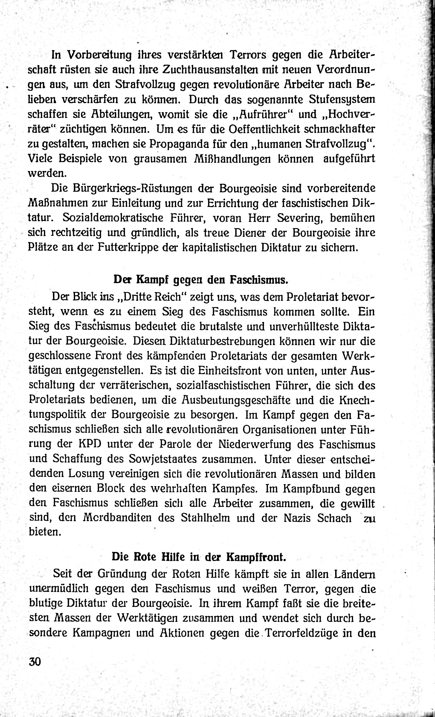Die vorliegende Broschüre bietet eine kritische Analyse des Faschismus und seiner historischen sowie politischen Entwicklungen. Der Text ist gegliedert in verschiedene Abschnitte, die die Entstehung, Machtergreifung und Folgen des Faschismus beleuchten, insbesondere unter Mussolini, Pilsudski und Hitler. Das Werk schildert die soziale und wirtschaftliche Krise der 1930er Jahre als Nährboden für den Faschismus und verurteilt die brutalen Methoden, mit denen Sozial- und Nationalfaschismus ihre Macht sichern und die Arbeiterklasse unterdrücken.