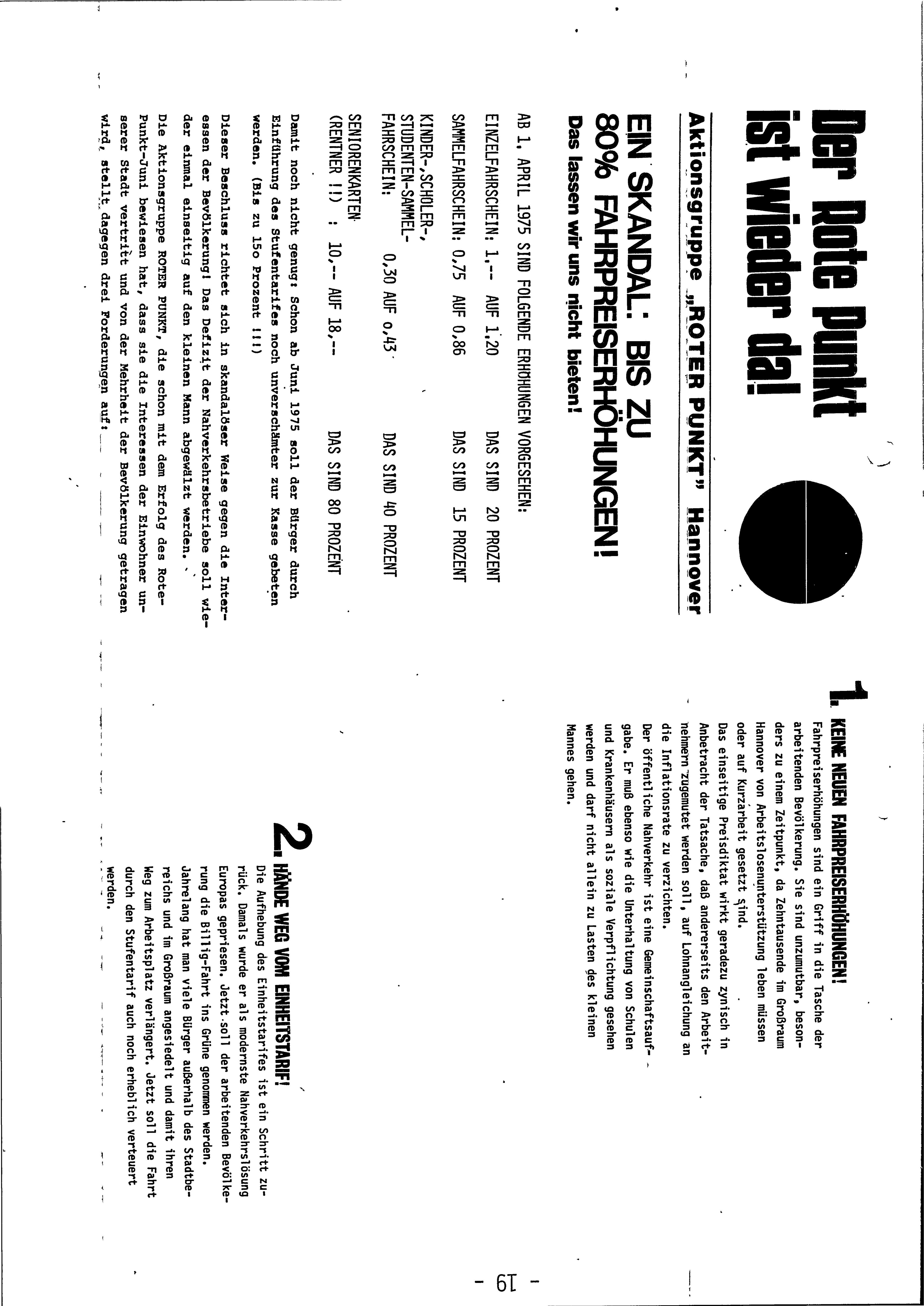 Die Dokumentation aus dem Jahr 1975 befasst sich mit den Protesten der hannoverschen Bevölkerung gegen geplante Fahrpreiserhöhungen im öffentlichen Nahverkehr und dokumentiert die Aktivitäten und Forderungen der Aktionsgruppe "Roter Punkt". Diese hatte bereits 1969 eine zentrale Rolle gespielt, als durch Massenproteste eine Fahrpreiserhöhung erfolgreich verhindert wurde. Damals wurde der sogenannte Einheitstarif eingeführt, der eine gerechte und erschwingliche Nutzung des Nahverkehrs gewährleisten sollte. Trotz der damaligen Zusage der Stadtverwaltung, den 50-Pfennig-Tarif dauerhaft beizubehalten, kam es in den darauffolgenden Jahren zu mehrfachen Tarifsteigerungen. Die geplanten Erhöhungen 1975 sollten die Fahrpreise um bis zu 150 Prozent anheben, was insbesondere sozial schwächere Bevölkerungsgruppen erheblich belastet hätte.