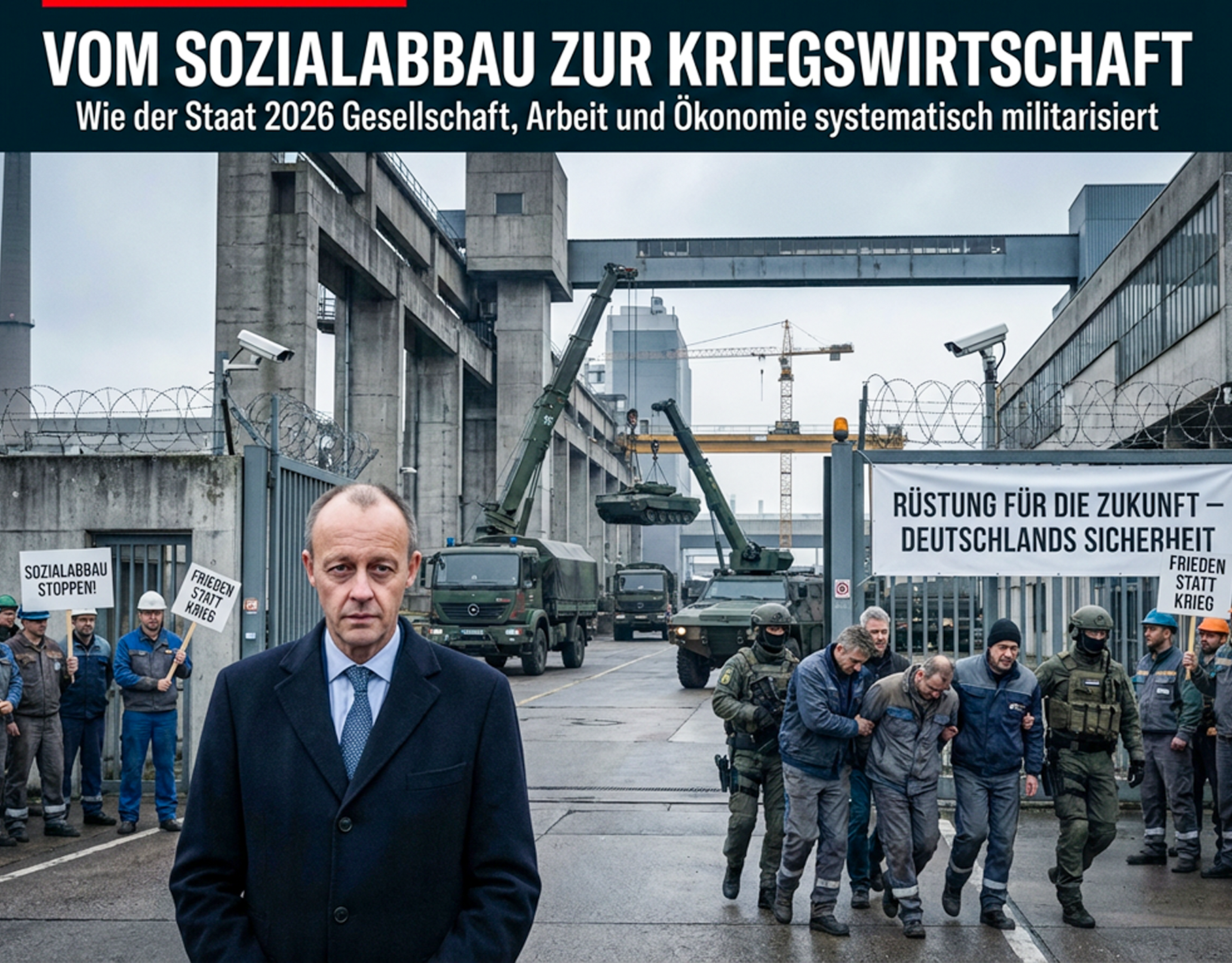 Das Jahr 2026 markiert eine neue Stufe des reaktionär-militaristischen Umbaus in der Bundesrepublik. Was sich seit Jahren vorbereitet hat, tritt nun offen und gebündelt hervor: Unter dem Vorwand von „Sicherheit“, „Zeitenwende“ und „Verteidigungsfähigkeit“ werden Staat, Wirtschaft und Gesellschaft auf einen dauerhaften Kriegszustand ausgerichtet.