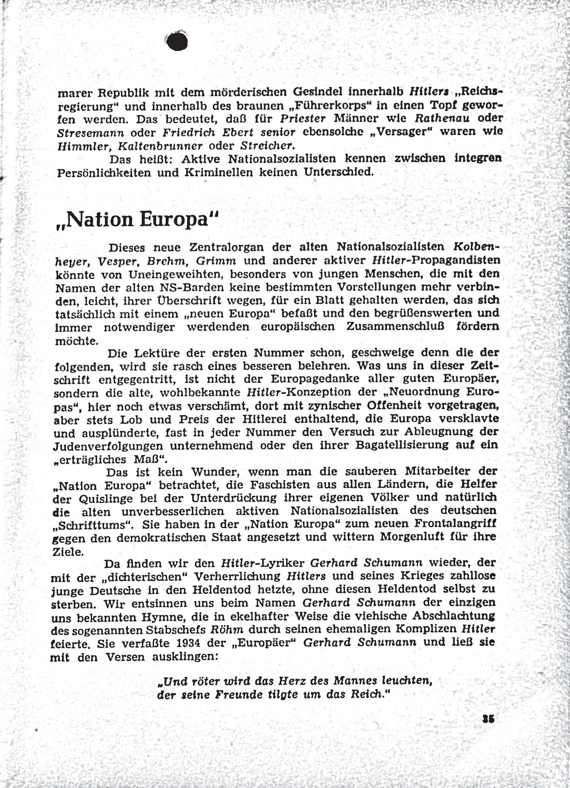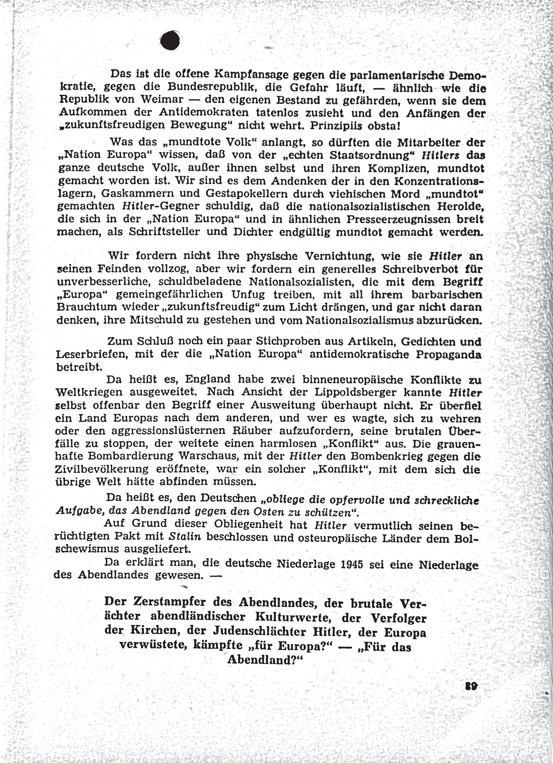 Milan fordert ein radikales und umfassendes Verbot aller nationalsozialistisch ausgerichteten Organisationen und Publikationen, um die Verbreitung nationalsozialistischer Ideologie zu verhindern. Er kritisiert die deutsche Nachkriegspolitik und -medien, da sie es versäumten, eine konsequente politische Aufklärung und Distanzierung von der NS-Vergangenheit zu gewährleisten. Solange rechtsradikale Publikationen und Gruppierungen erlaubt sind, bleibt die Gefahr bestehen, dass die deutsche Gesellschaft weiterhin durch revisionistische und fremdenfeindliche Ideologien beeinflusst wird.