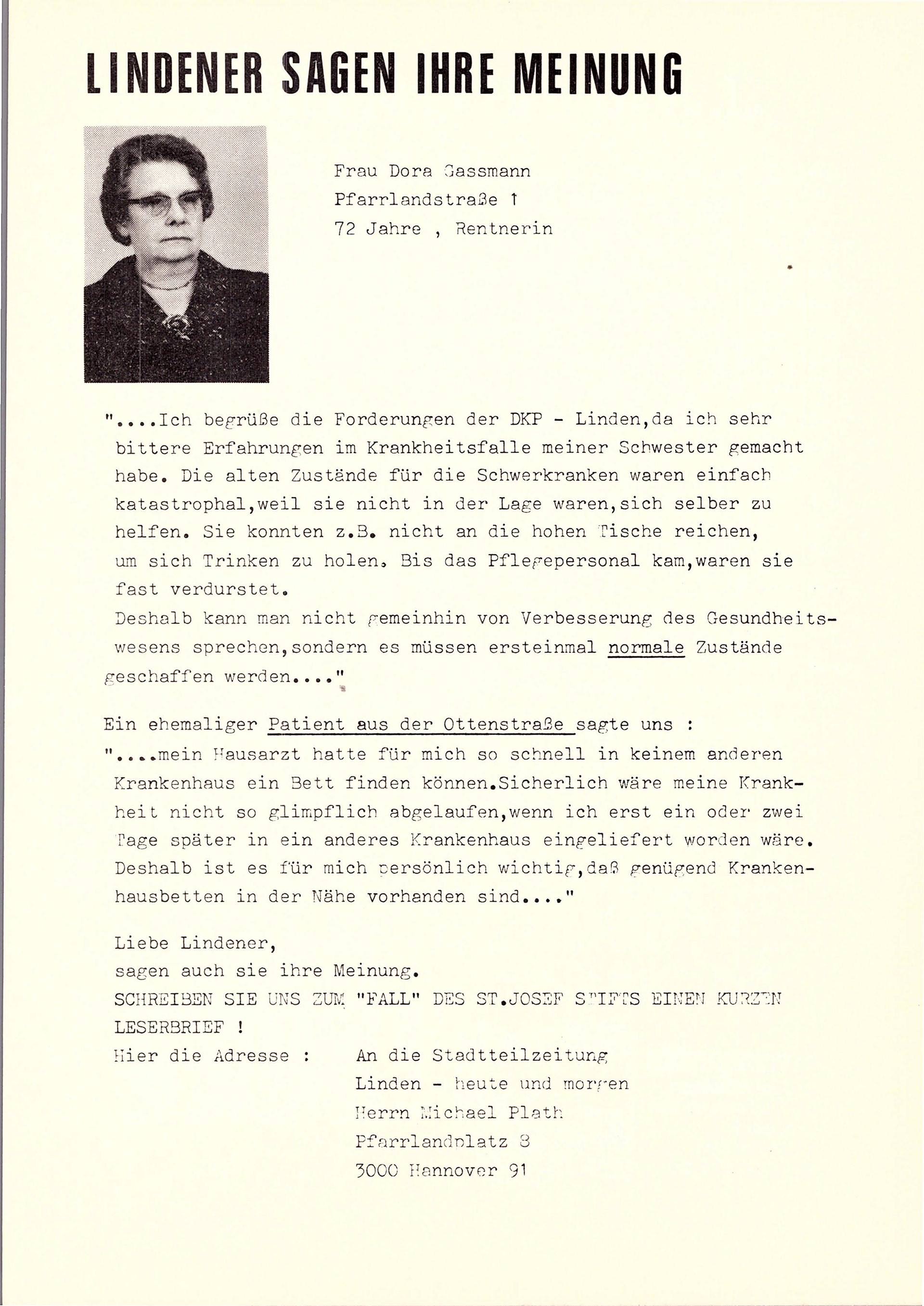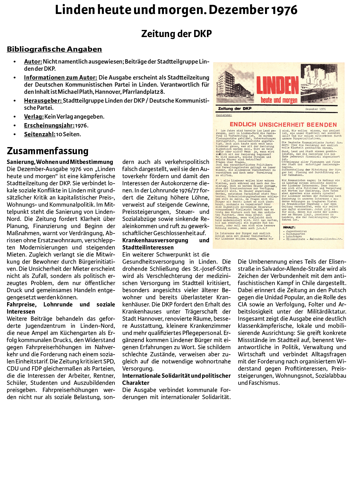 Die Ausgabe von Linden heute und morgen vom Dezember 1976 behandelt mehrere zentrale Themen aus dem Stadtteil Linden-Nord in Hannover, darunter die Sanierung des Viertels, soziale und politische Anliegen, sowie wirtschaftliche und kulturelle Herausforderungen. Die Sanierungspläne sind geprägt von Unsicherheit und Verärgerung der Anwohner, da Entscheidungen unklar bleiben und Modernisierungen schleppend verlaufen. Forderungen nach Transparenz und Bürgerbeteiligung stehen im Mittelpunkt.