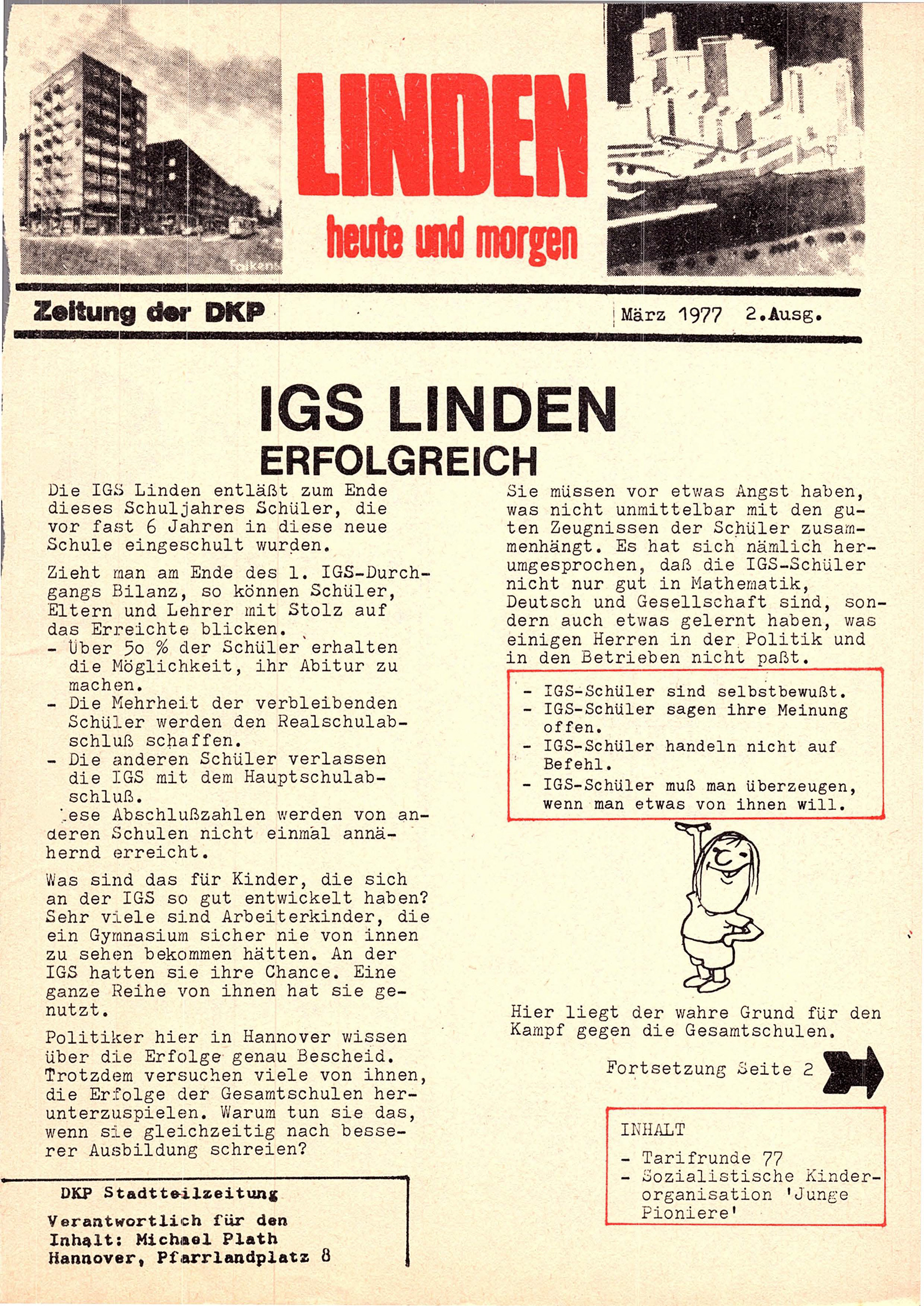Die Ausgabe von "Linden heute und morgen" aus dem März 1977 berichtet über diverse lokale und politische Themen, darunter die Erfolge der Integrierten Gesamtschule (IGS) Linden, soziale Ungerechtigkeiten und die Tarifrunde im öffentlichen Dienst. Die IGS Linden wird für ihre innovativen Bildungsansätze gelobt, die Schülern aus Arbeiterfamilien den Zugang zu besseren Bildungsabschlüssen ermöglichten. Trotz ihrer Erfolge wird die Gesamtschule politisch angegriffen, was die Deutsche Kommunistische Partei (DKP) als Kampf gegen selbstbewusste und unabhängige Schüler deutet.