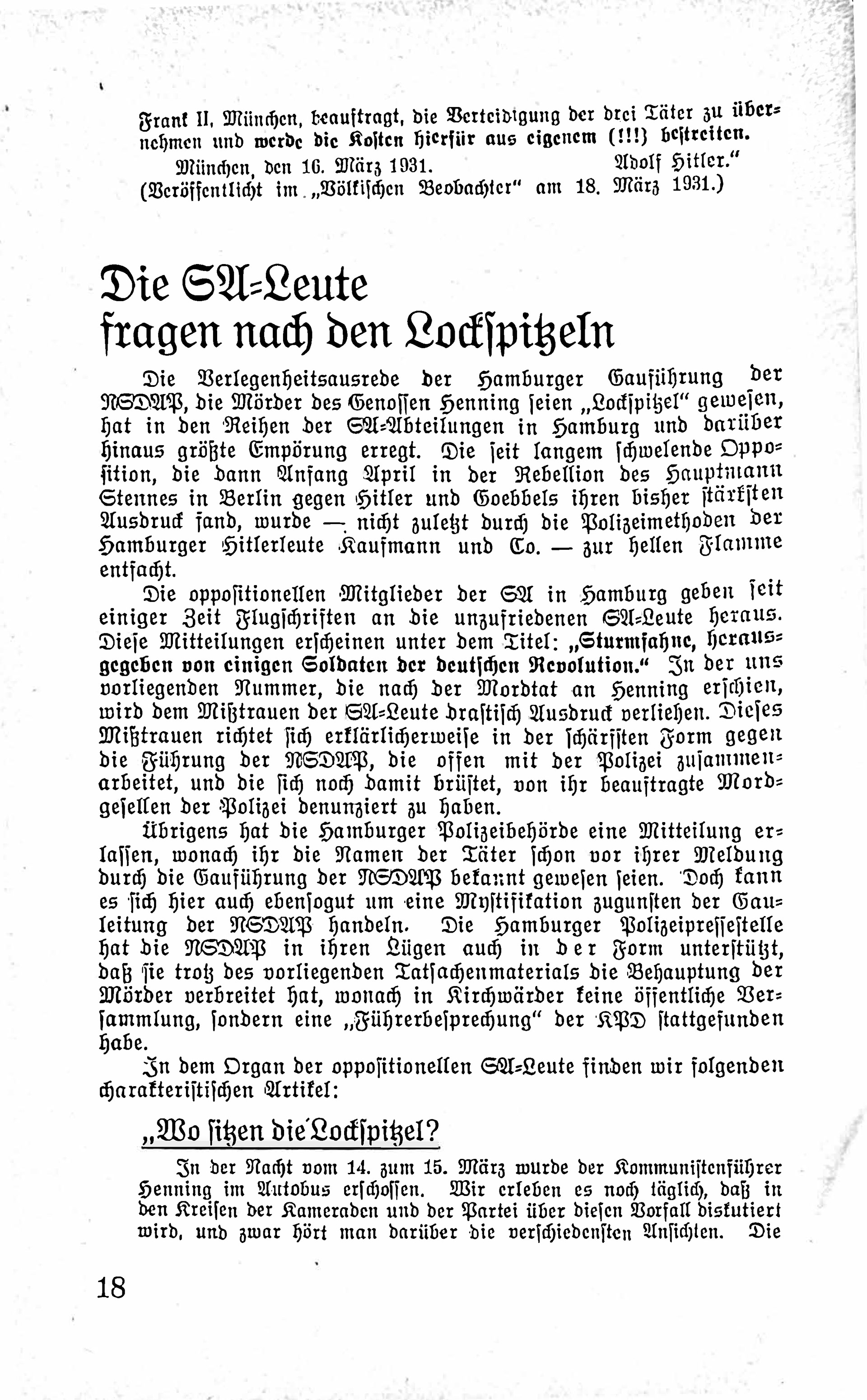 Der Text beschreibt die politische und soziale Lage in Deutschland zur Zeit des Mordes an Ernst Henning, einem kommunistischen Arbeiterführer, der im März 1931 von faschistischen Kräften ermordet wurde. Henning wird als Symbol des Widerstands gegen Faschismus und kapitalistische Unterdrückung dargestellt. Der Mord löste eine breite Protestbewegung aus, die von der Regierung mit Repressionen wie Versammlungsverboten und Zensur beantwortet wurde. Der Text kritisiert die kapitalistische Ausbeutung, insbesondere die ungerechte Behandlung kleiner Bauern, und zeigt die Verbindung zwischen staatlicher Gewalt und wirtschaftlicher Unterdrückung auf. Henning wird als Märtyrer im Kampf für soziale Gerechtigkeit und gegen faschistische Herrschaft geehrt.