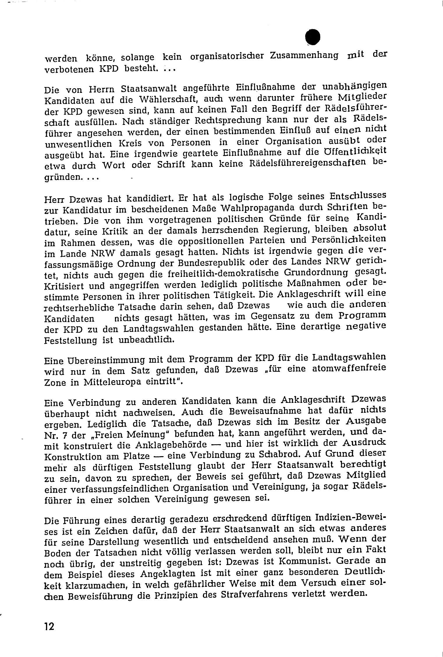 Der Text beschreibt einen politischen Mammutprozess, der 1959 vor der IV. Großen Strafkammer des Landgerichts Düsseldorf stattfand und im Kontext des Landtagswahlkampfs von Nordrhein-Westfalen 1958 steht. Kern des Prozesses war die Anklage gegen 15 frühere Mitglieder der 1956 verbotenen KPD, die sich als parteilose Kandidaten zur Wahl gestellt hatten. Ihre Kandidatur basierte auf dem Landeswahlgesetz, das parteilose Bewerbungen seit 1947 zuließ. Dennoch führte ein geheimes Schreiben des Innenministers an die Kreiswahlausschüsse dazu, dass zahlreiche Kandidaturen abgelehnt wurden, obwohl die gesetzlichen Anforderungen erfüllt waren. Diese Ablehnung erfolgte, um politischen Gegnern der Atomrüstung entgegenzuwirken.