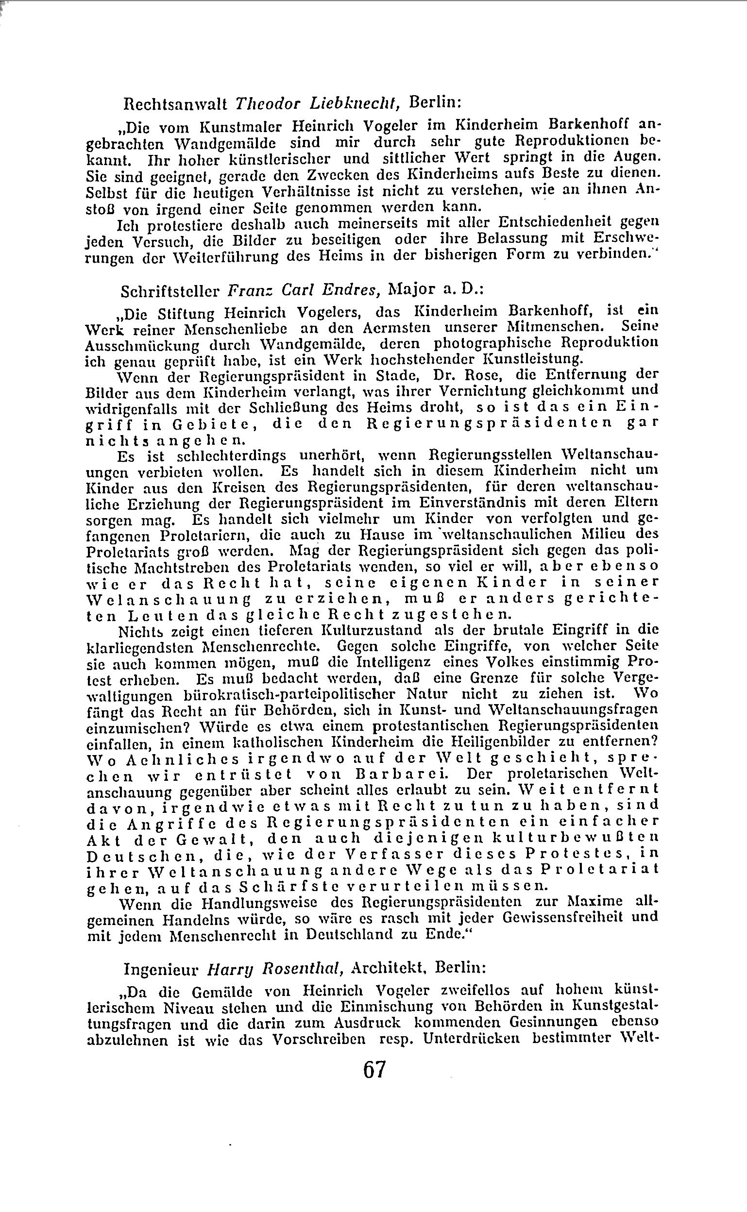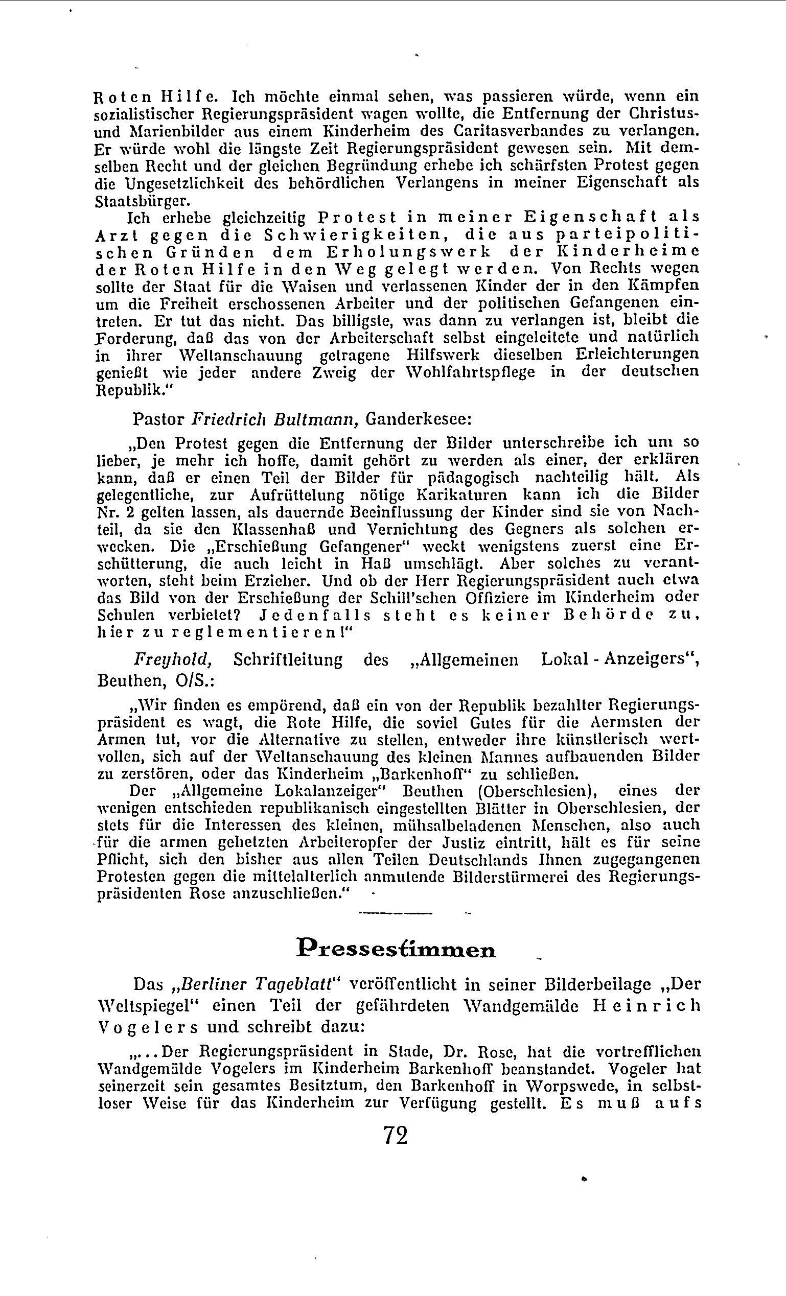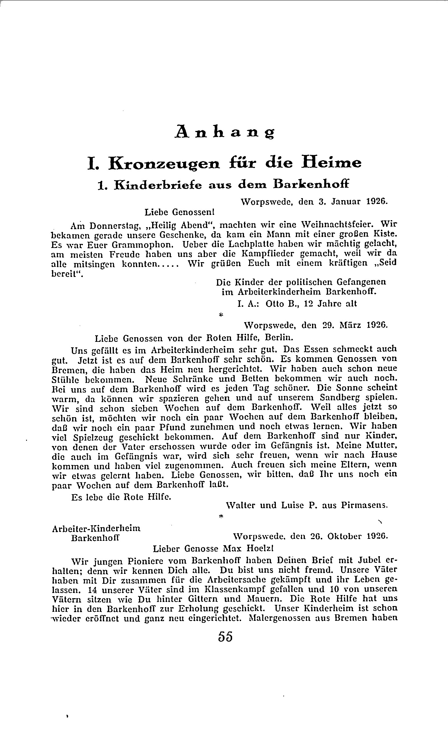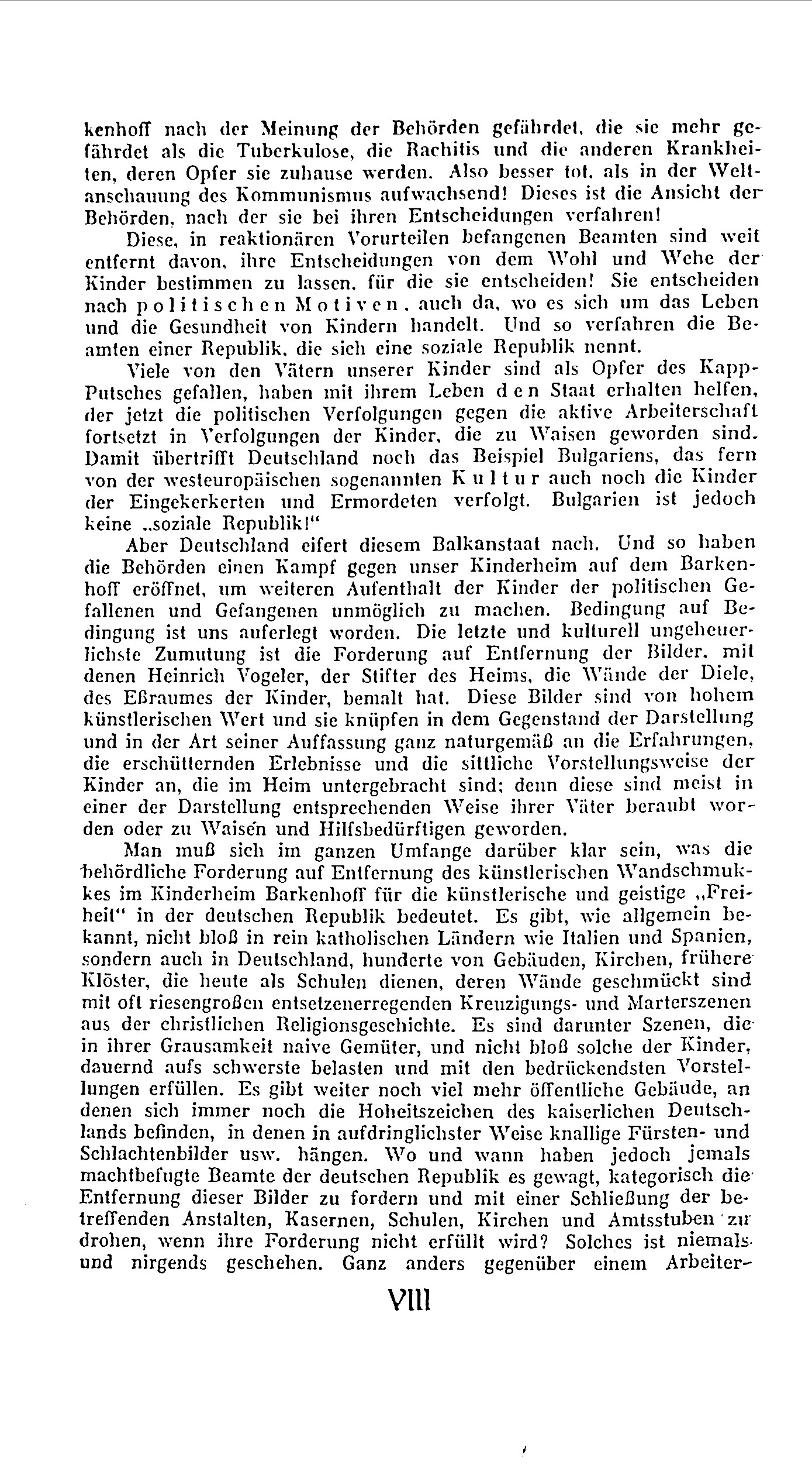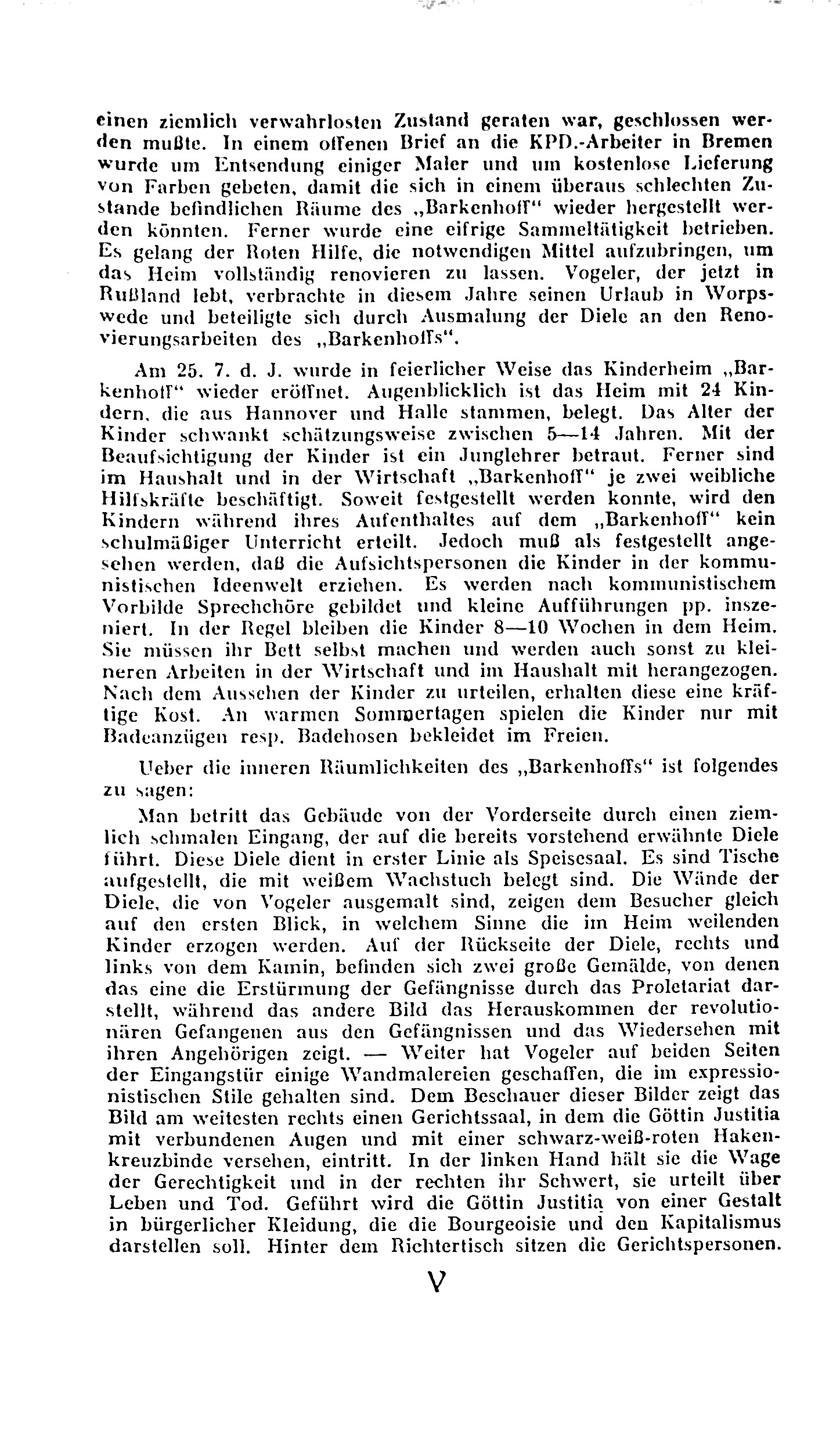 Der Text behandelt die Kontroverse um das Kinderheim "Barkenhoff," das von der Roten Hilfe Deutschlands betrieben wurde. Ursprünglich der Künstlerresidenz Heinrich Vogelers in Worpswede gewidmet, wurde das Anwesen in den 1920er-Jahren in ein kommunistisches Kinderheim umgewandelt, um Kindern von politischen Gefangenen und Revolutionären Schutz und Erholung zu bieten. Die Behörden sahen die Einrichtung jedoch als Bedrohung, da sie befürchteten, die Kinder könnten durch die kommunistische Erziehung zu politischen Aktivisten werden. Dies führte zu polizeilichen Maßnahmen und letztlich zur Schließung des Heims.