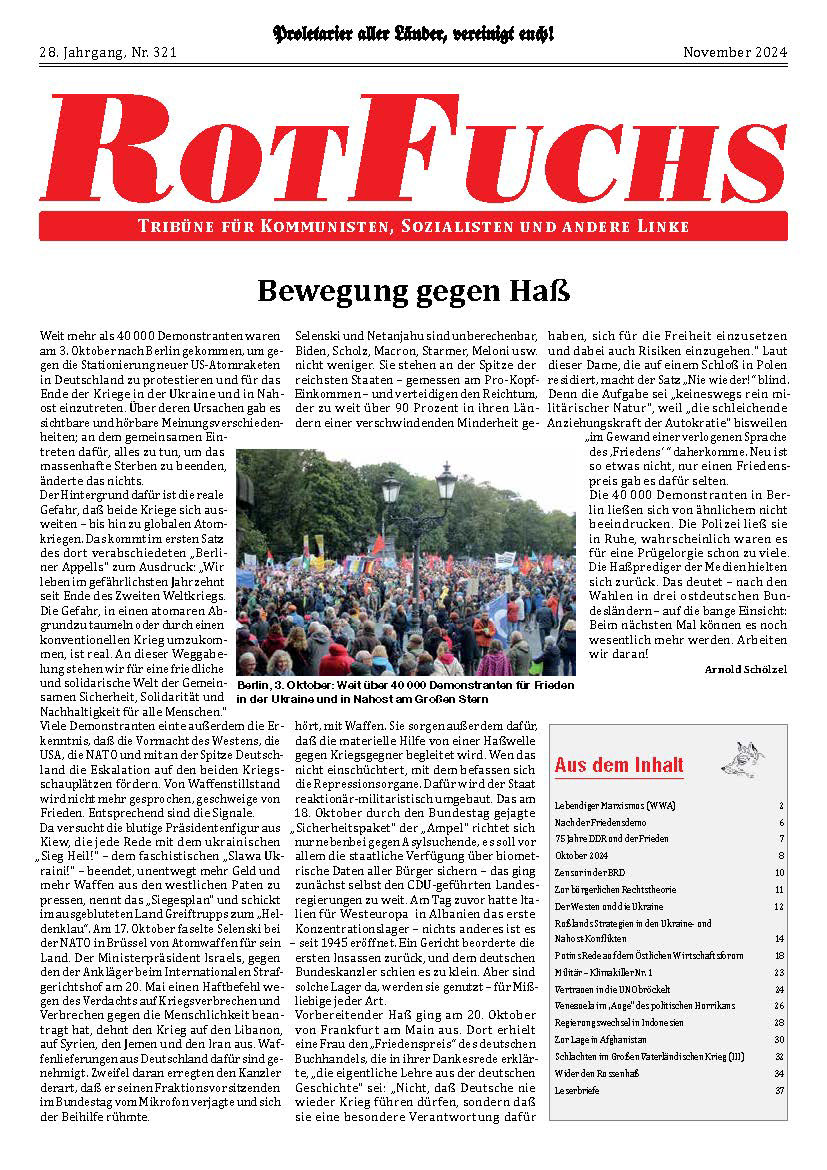 Der Artikel in der Oktober-Ausgabe des "RotFuchs" berichtet über eine Demonstration am 3. Oktober in Berlin, die von der Initiative „Nie wieder Krieg – Die Waffen nieder!“ organisiert wurde. Die Hauptforderungen der Demonstration waren die sofortige Beendigung der Kriege in der Ukraine und Gaza, der Abzug von Atomwaffen aus Deutschland, die Unterzeichnung des Atomwaffenverbotsvertrags sowie das Verbot der Stationierung von US-Mittelstreckenraketen in Deutschland. Unterstützt wurde die Demonstration von verschiedenen linken Gruppen, SPD-Gliederungen, der DKP, dem Bündnis Sahra Wagenknecht und weiteren Organisationen.