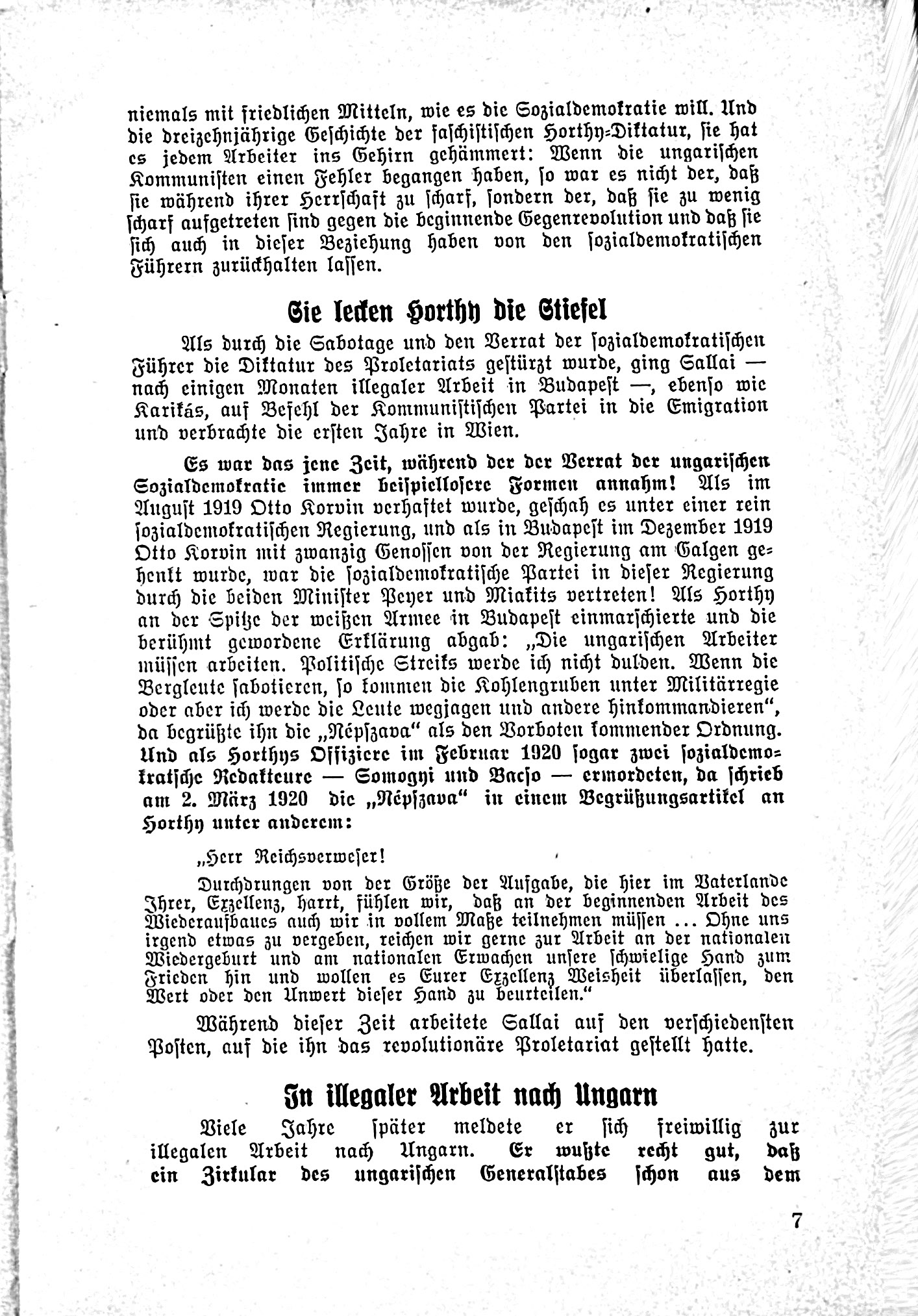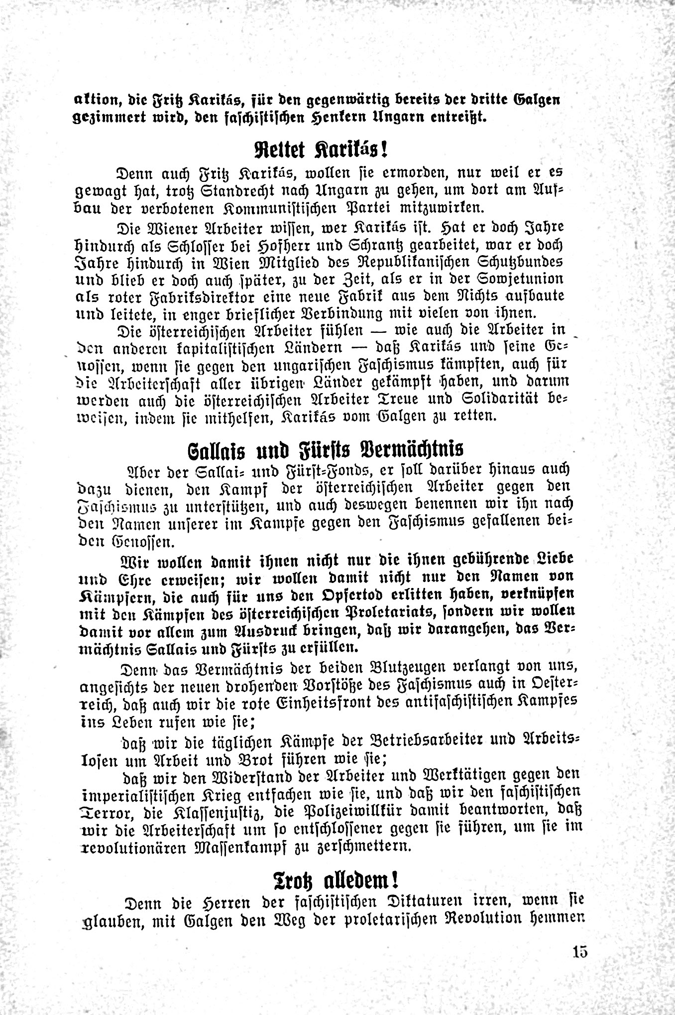 Der Text beschreibt die Hinrichtung zweier ungarischer Kommunisten, welche 1949 nach einem unfairen Gerichtsprozess unter brutalsten Bedingungen verurteilt wurden. Ihre Folter, die Verweigerung einer Verteidigung und die Schnellurteile lösten Empörung in der Arbeiterklasse und unter Intellektuellen aus. Der Text kritisiert den ungarischen Faschismus scharf und betont, dass solche Taten Ausdruck seiner Machtlosigkeit seien. Gleichzeitig warnt er vor einer Eskalation des Kapitalismus hin zu einer offenen Unterdrückung der Arbeiterklasse, einschließlich neuer imperialistischer Kriege. Die Ereignisse symbolisieren den verzweifelten Versuch der Herrschenden, ihre Macht zu sichern.