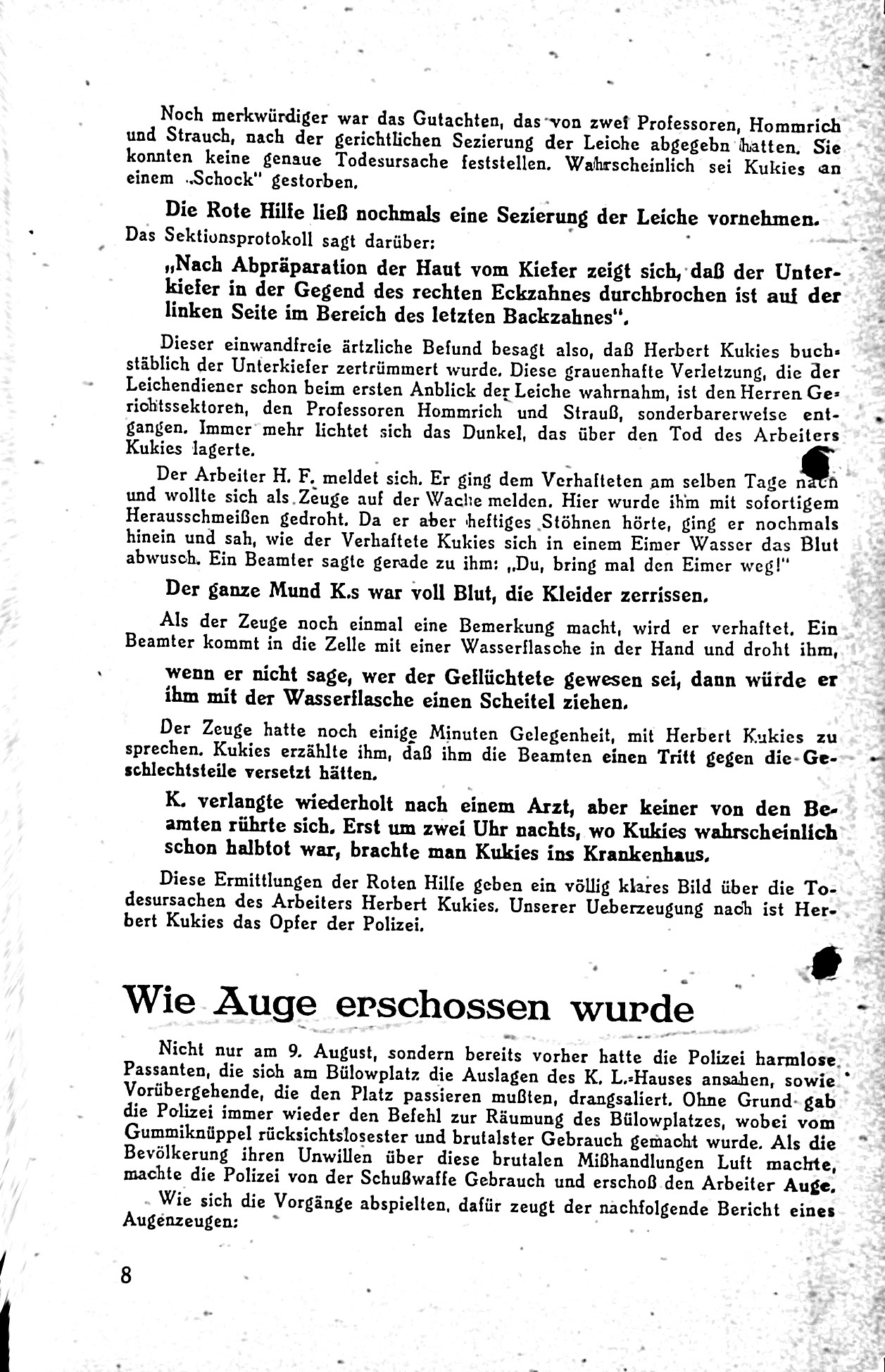 Der Text beschreibt die Ereignisse am 9. August 1931 vor dem Karl-Liebknecht-Haus in Berlin, in denen es zu gewaltsamen Auseinandersetzungen zwischen Polizei und Arbeitern kam. Diese Vorgänge werden als Teil eines umfassenden staatlichen Terrors gegen die kommunistische Arbeiterbewegung dargestellt, die insbesondere von der Sozialdemokratie und deren Polizeiorganen unterstützt worden sei. Der Text zieht Parallelen zu früheren repressiven Ereignissen wie den Märzunruhen 1921 und den blutigen Maikämpfen 1929, bei denen ebenfalls Arbeiter durch Polizeigewalt getötet wurden.