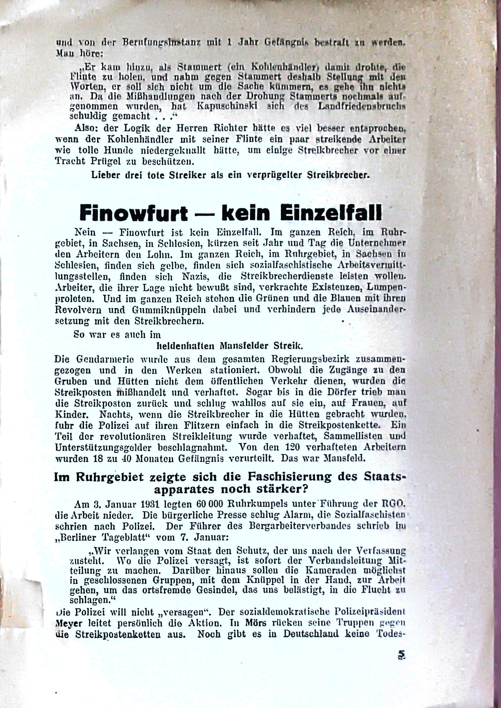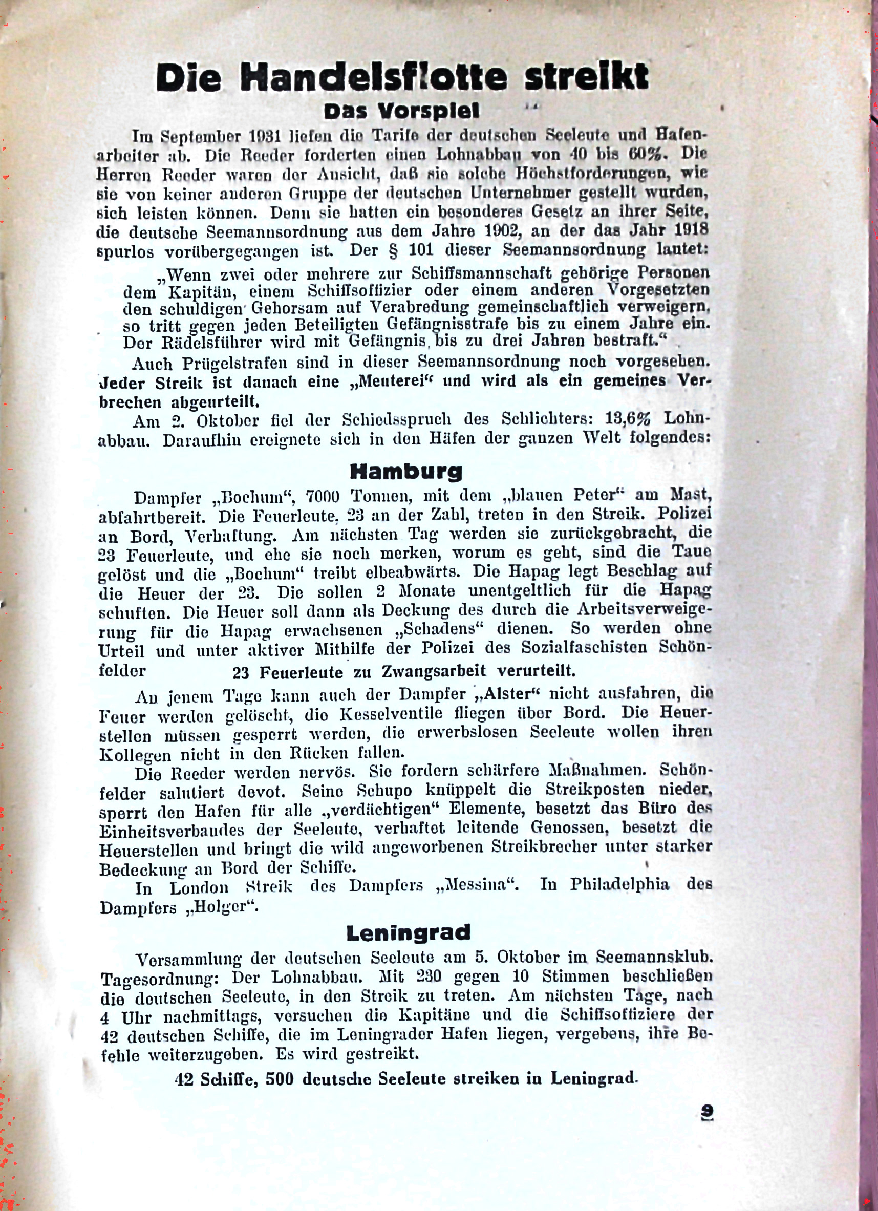 Der Text ist ein Dokument, das Arbeitskämpfe, Streiks und die schwierigen sozialen Bedingungen der Arbeiter in Deutschland in den frühen 1930er-Jahren beleuchtet. Es thematisiert insbesondere Lohnabbau, Massenentlassungen und die Repressionen gegen Streikende, einschließlich Sondergerichte und harte Urteile gegen Arbeiter.