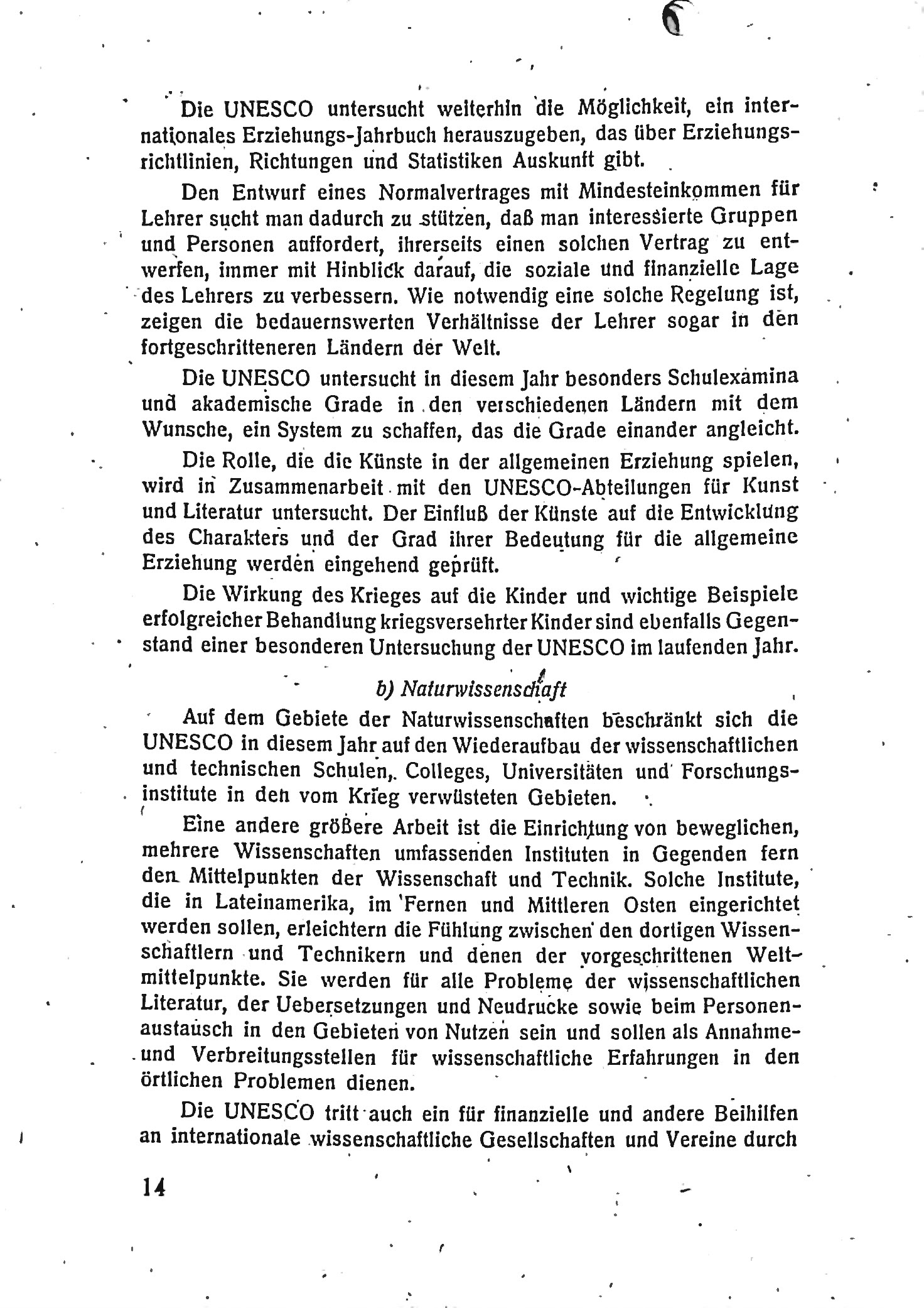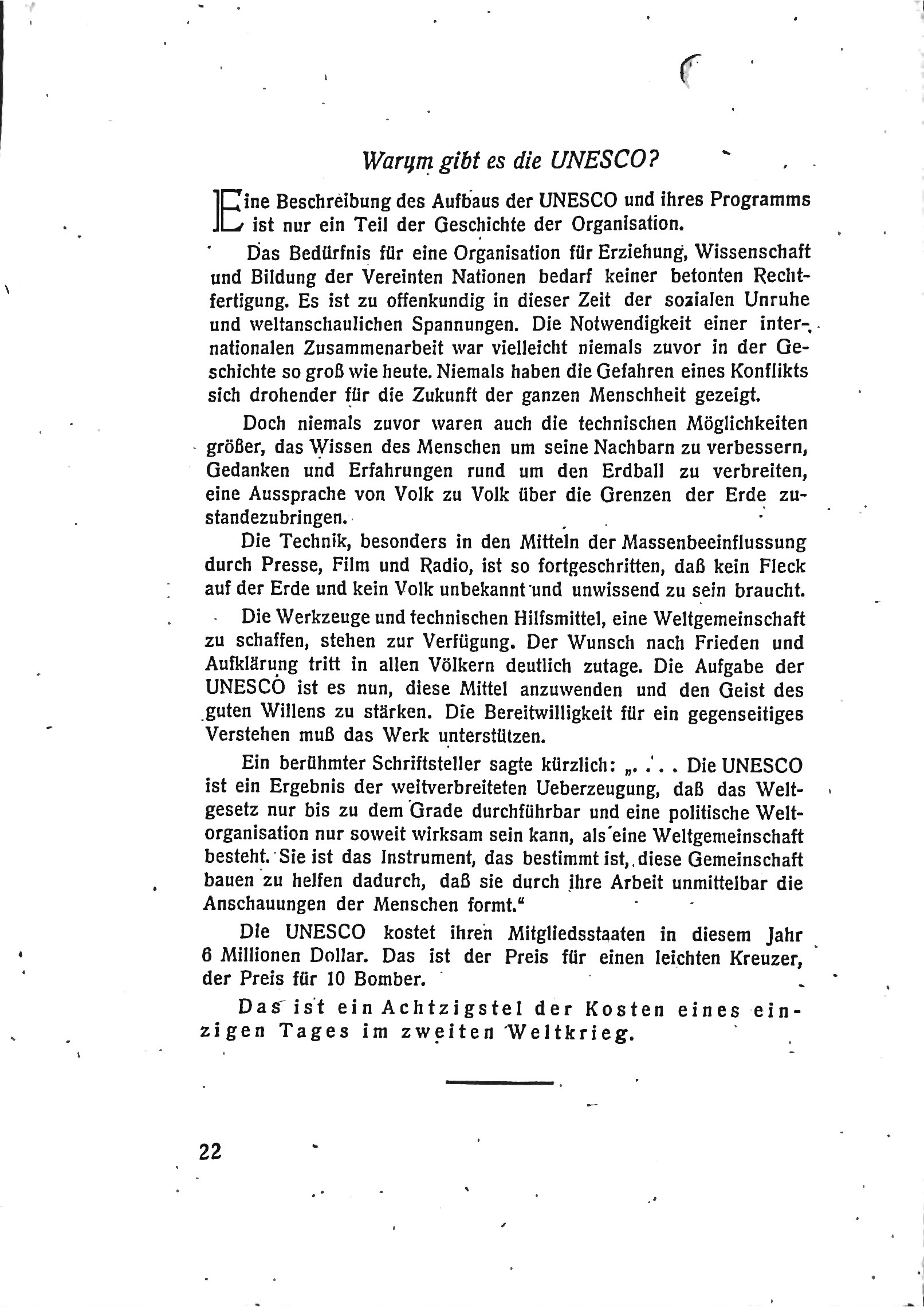 Der Text beschreibt die Gründung und die Aufgaben der UNESCO (United Nations Educational, Scientific and Cultural Organization) im Jahr 1946 sowie ihre ersten Pläne und Ziele. Die UNESCO wurde als spezialisierte Abteilung der Vereinten Nationen (UNO) gegründet, um den Weltfrieden und das gegenseitige Verständnis durch Bildung, Wissenschaft und Kultur zu fördern. Ihr Gründungsgedanke basiert auf der Vision einer Weltgemeinschaft, in der alle Menschen in Harmonie zusammenleben und miteinander arbeiten können.